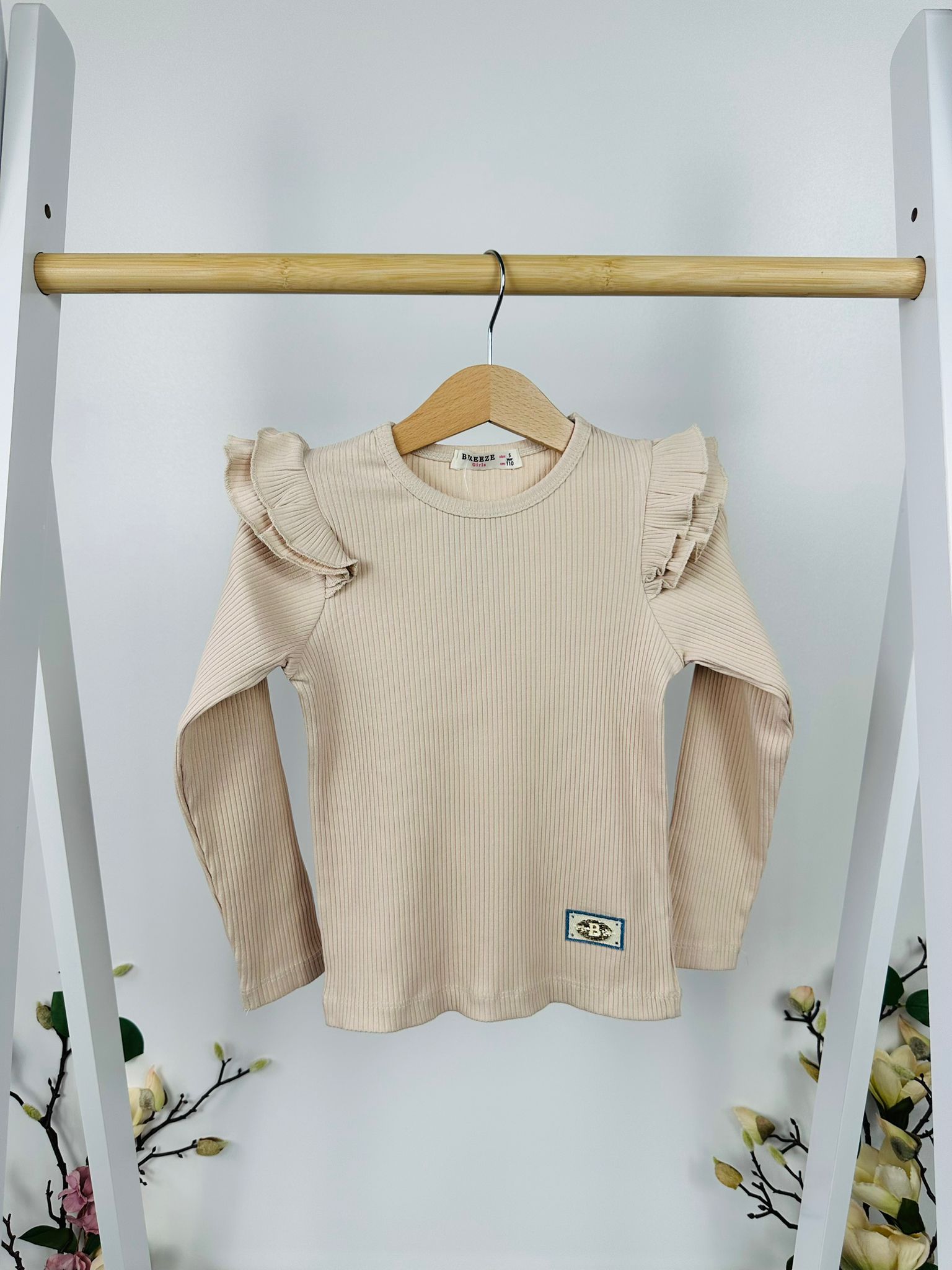 Нежна визия с внимание към детайла! 🌸✨ Тази блуза в нежен пудрен нюанс впечатлява с изчистена линия и елегантни къдрички на раменете, които придават чаровен акцент на визията. Подходяща както за ежедневие, така и за по-специални поводи.