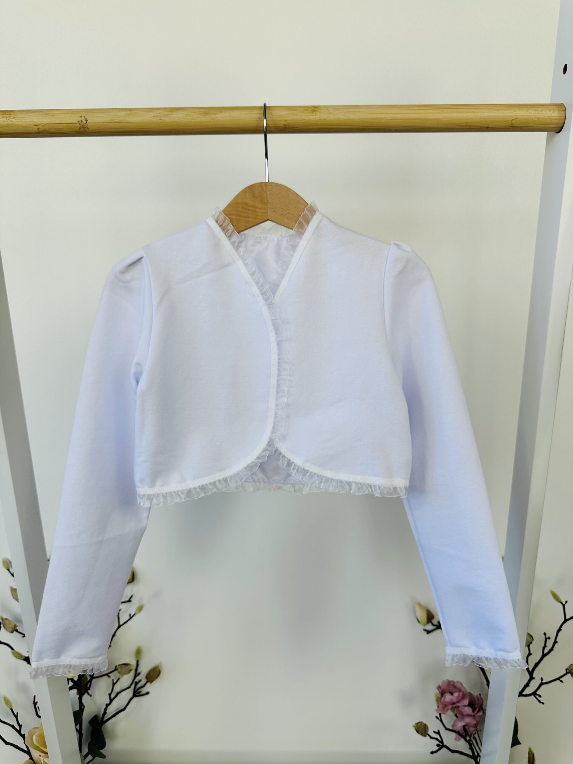Това нежно болеро с дълъг ръкав е създадено да допълни официалните тоалети на всяка малка госпожица с изящество и мекота. Деликатната завършваща дантела по краищата придава романтичен завършек и подчертава фината линия на модела.