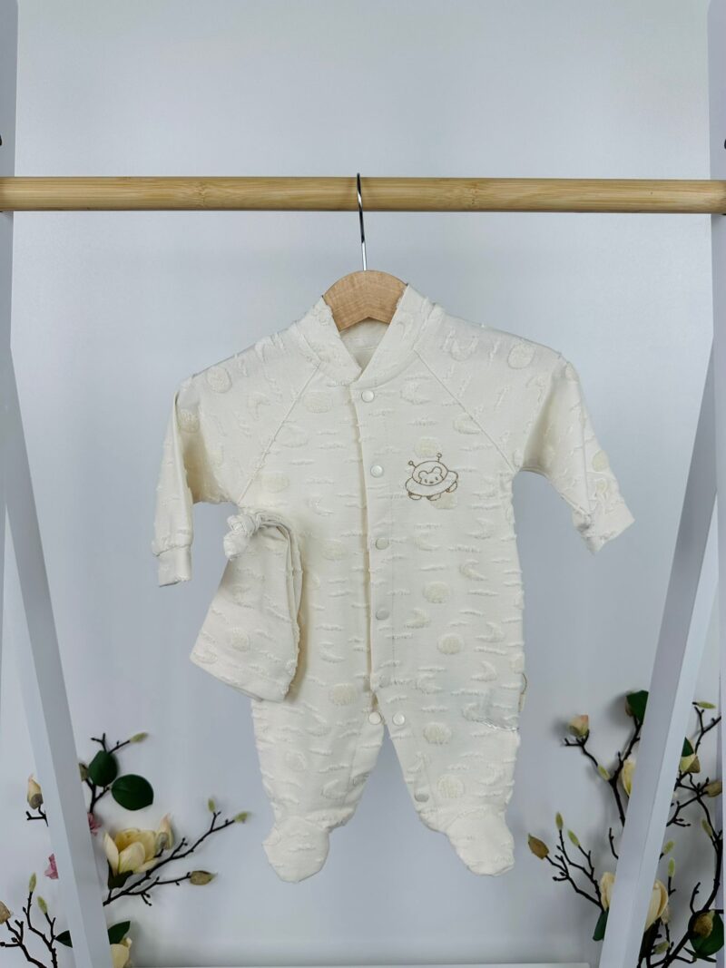 Потопете вашето мъниче в мекота и абсолютен уют с този изящен гащеризон, създаден да осигури комфорт и нежност още от първите дни. Деликатната релефна текстура и фината мечешка апликация придават стилен и изчистен вид, който е едновременно елегантен и подходящ за ежедневна употреба.