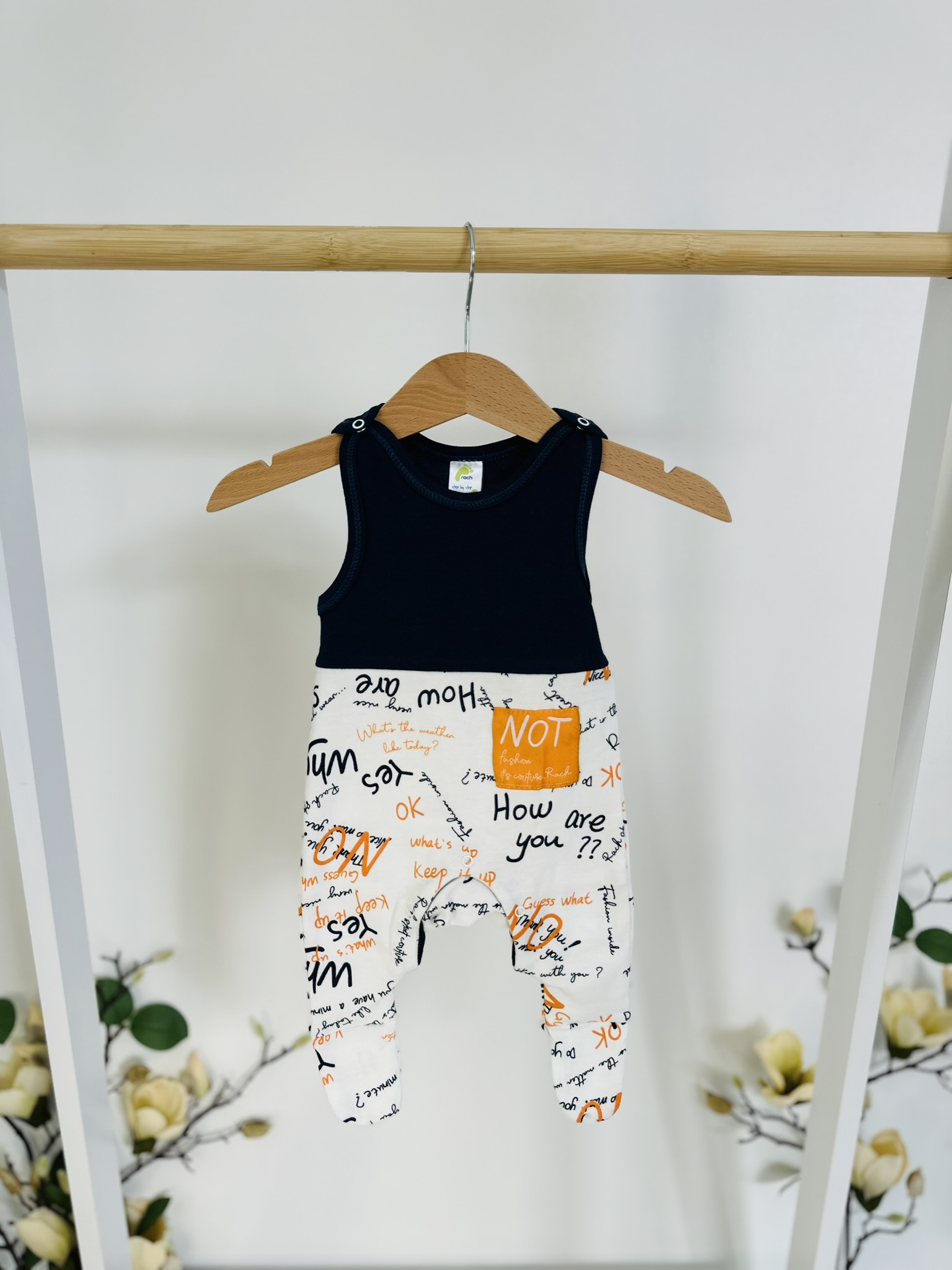 За малките с характер и стил! Този гащеризон с изчистена горна част и забавен долен дизайн с надписи носи свежест и настроение. Текстовите елементи създават градски, модерен стил, а удобната кройка с крачета и тик-так копченца на презрамките правят дрешката практична за ежедневието.