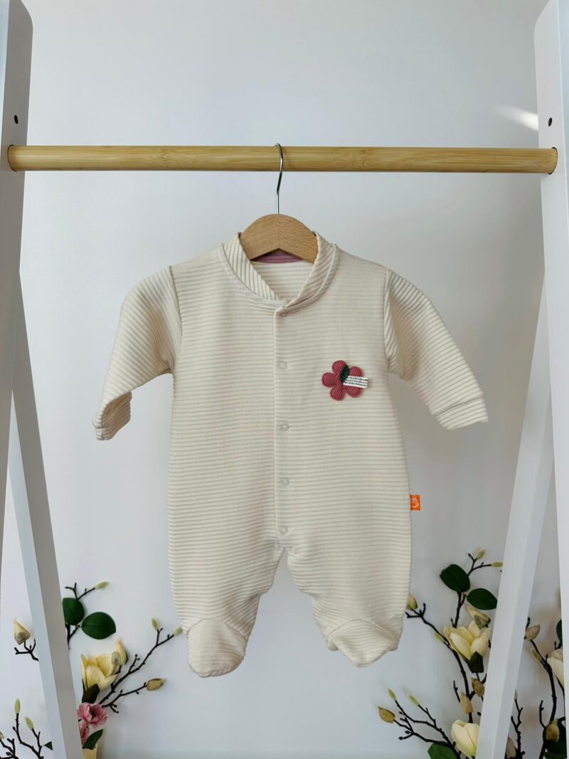 Нежен и стилен гащеризон, който съчетава уют и изящество в едно. С фино райе и деликатна апликация на цвете, той е идеален избор за първите месеци на всяко бебче. Подходящ както за сън, така и за ежедневен комфорт.