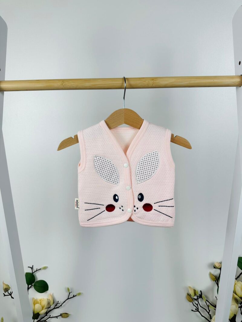 Този весел елек е чудесен избор за междинните сезони и хладните сутрини. Дизайнът с апликация на зайче създава настроение и носи чар на визията, докато удобната кройка осигурява свобода на движението и практичност в ежедневието. Подходящ за носене както у дома, така и при разходки, този модел бързо ще стане любим както на детето, така и на родителите.