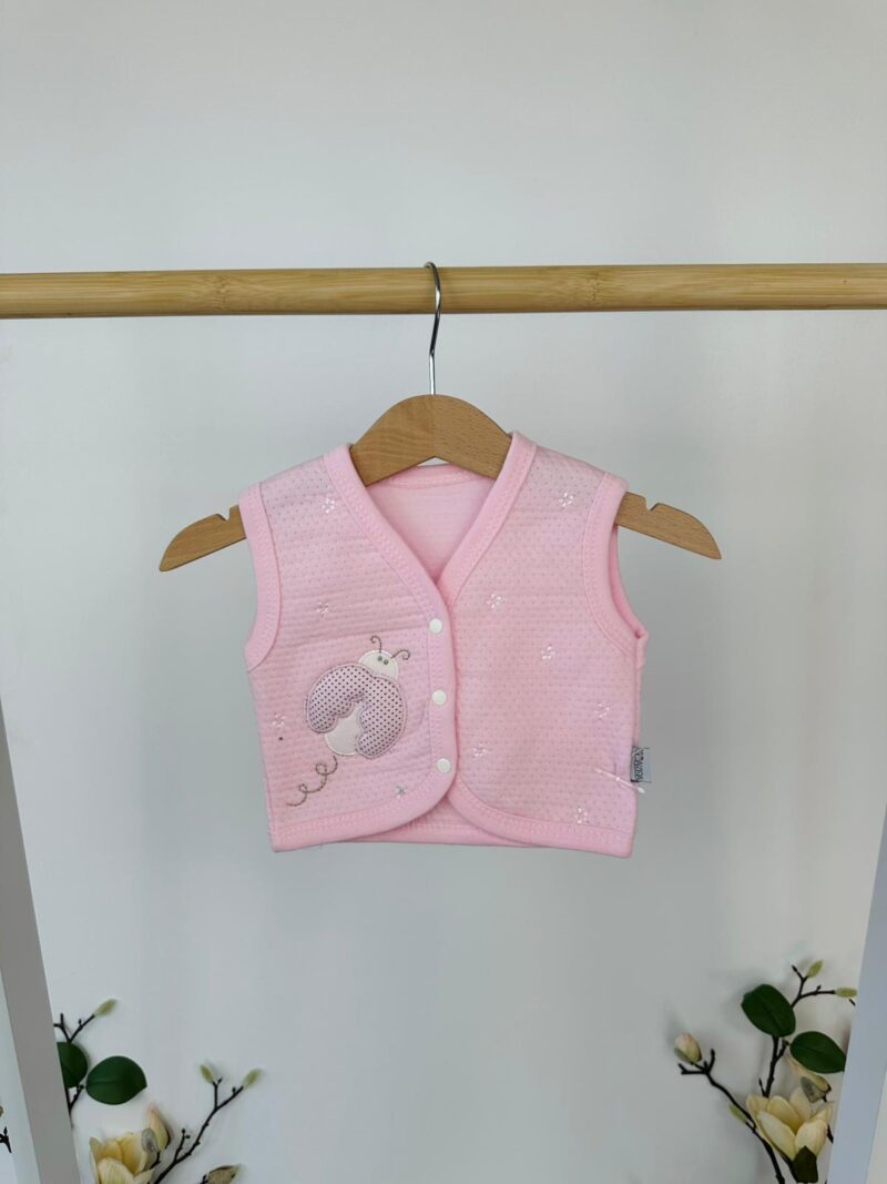 Очарователен бебешки елек в нежно розово, който съчетава комфорт и сладък дизайн. Украсен е с малка калинка и фини бродерийки, които придават игрив и деликатен акцент.
