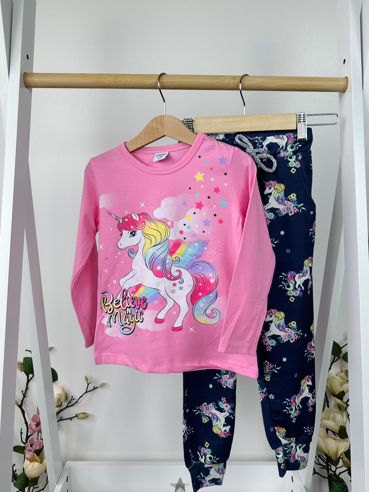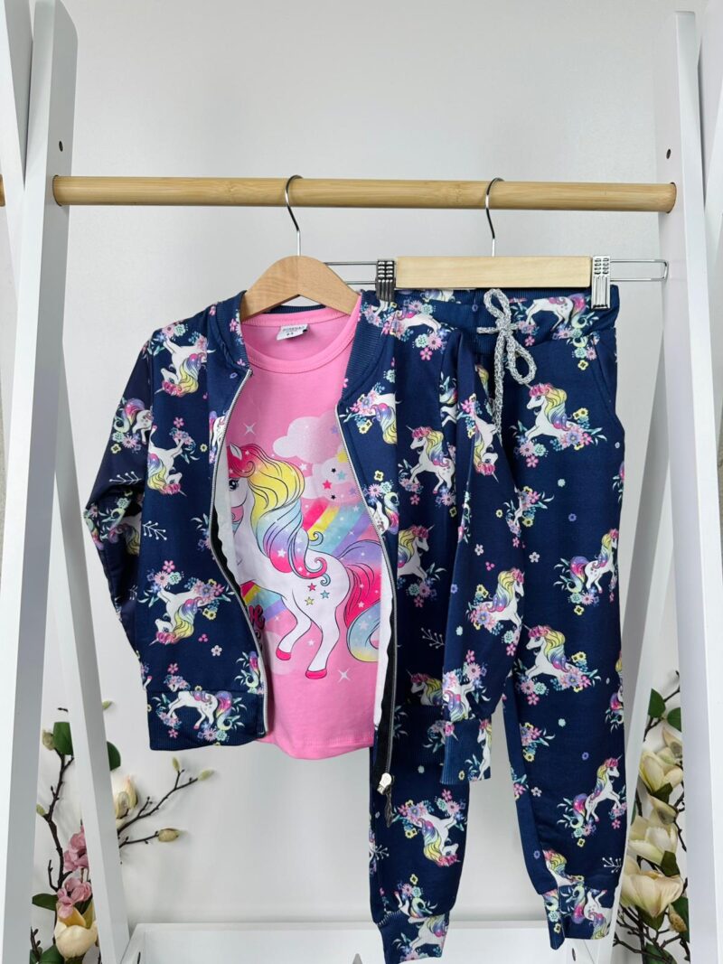 🦄✨ Когато въображението срещне стила! Този комплект от три части е истинска сбъдната мечта за всяко дете, което вярва в магията на еднорозите. Състои се от удобна блузка с принт, долнище с приказен десен и горнище с цип, което завършва визията с много настроение и цвят.