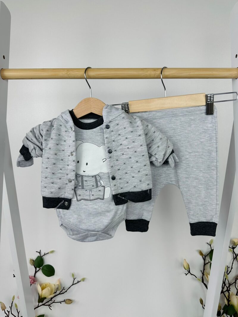 Готов ли е вашият мъник за уютните градски приключения? Този изключително стилен трикомплект съчетава нежна визия, практичност и модерно излъчване, което го прави идеален за ежедневието на малките откриватели. С фин дизайн и очарователна мечешка апликация, комплектът създава усещане за комфорт и топлина при всяко движение, като същевременно предлага завършена и изключително хармонична визия.