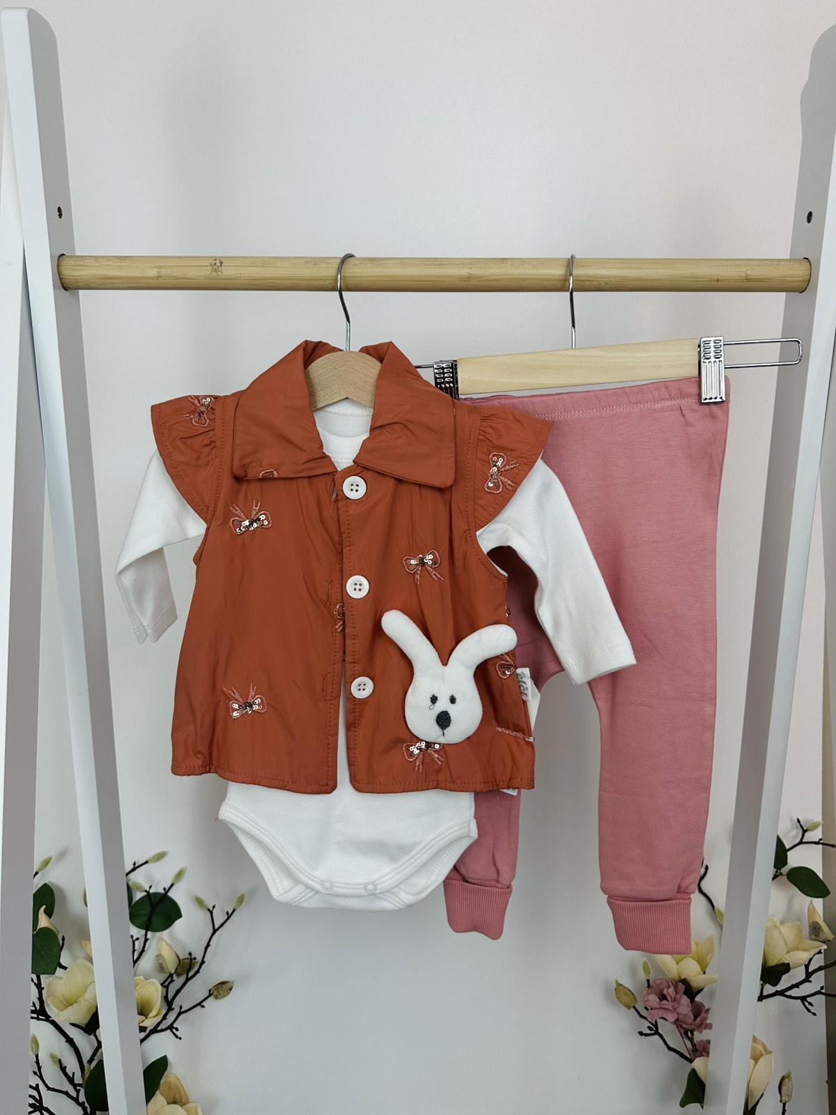 Този комплект от три части е истинско съчетание на стил, уют и игривост – създаден специално за по-хладните дни. Мекото боди с дълъг ръкав и принт на сладки зайчета осигурява комфорт през целия ден, докато розовият панталон с ластичен завършек гарантира свобода на движение. Елече в керемиден цвят, декориран с нежни бродерии и симпатично джобче-зайче, което придава индивидуалност и закачливост на визията.