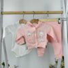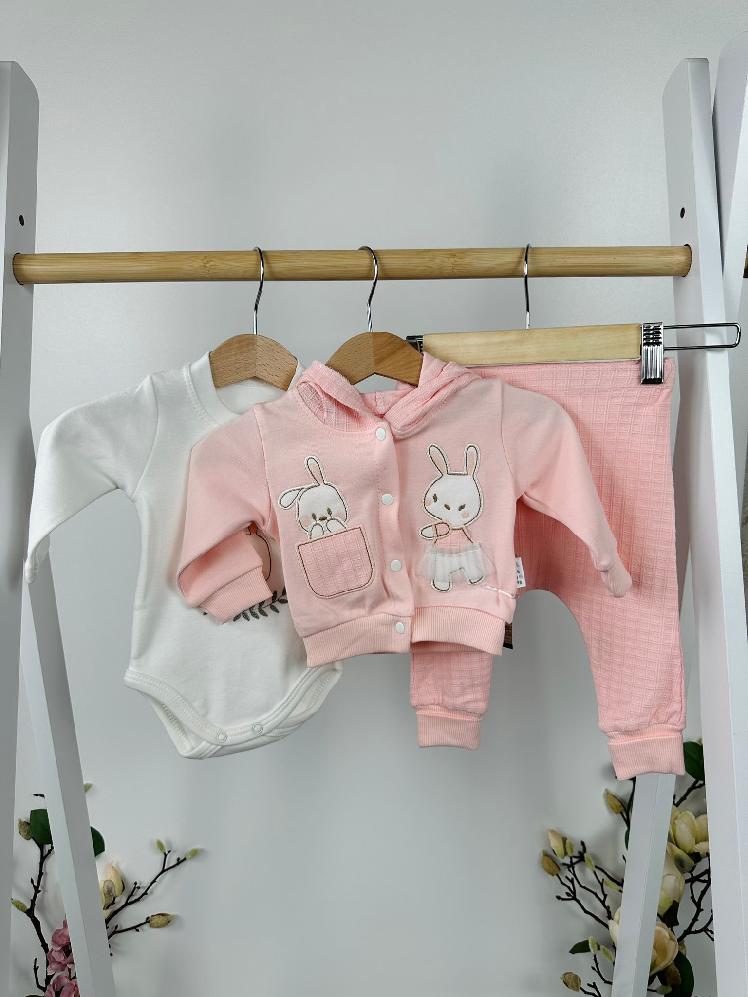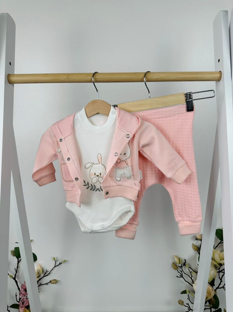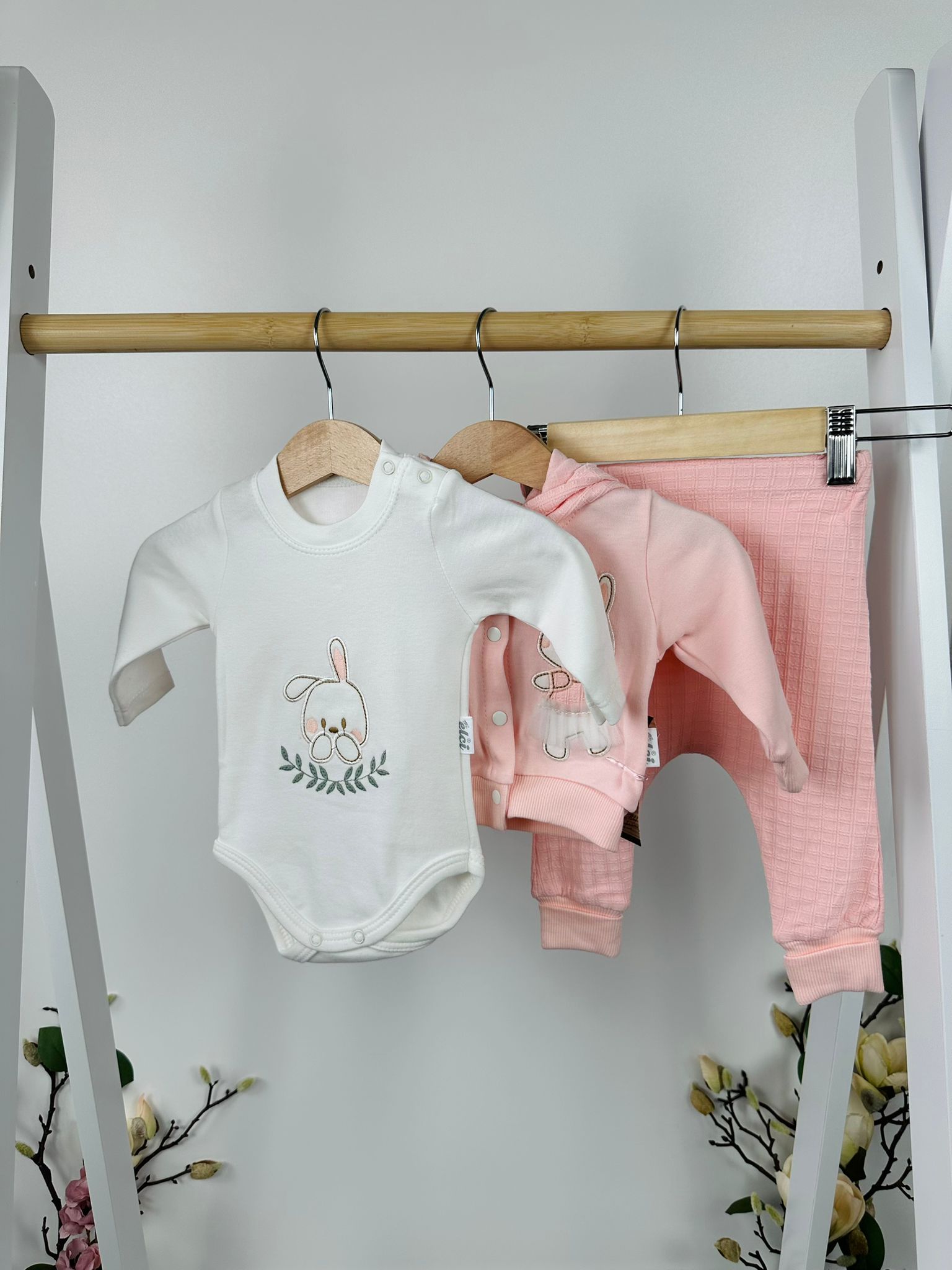 Комплектът се състои се от три части – меко боди с избродиран заек, панталон с удобна кройка и жилетка с качулка и игриви апликации. Дизайнът е създаден така, че да осигури комфорт през целия ден, независимо дали бебето си играе, почива или е навън.