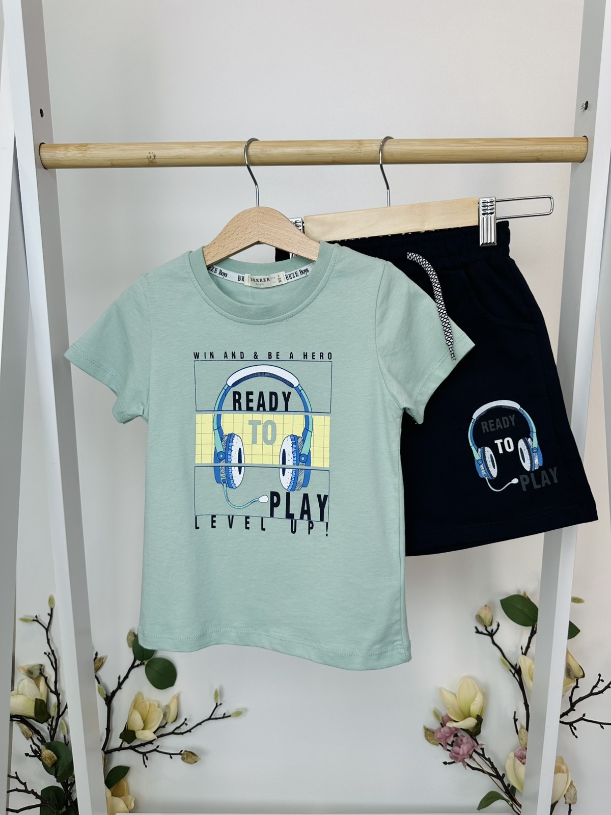 Готов за игра? Този стилен и удобен комплект е перфектният избор за всички малки геймъри и любители на активното ежедневие. Съчетание от свежа тениска и шорти, украсени с модерна щампа на слушалки и геймърски надписи.