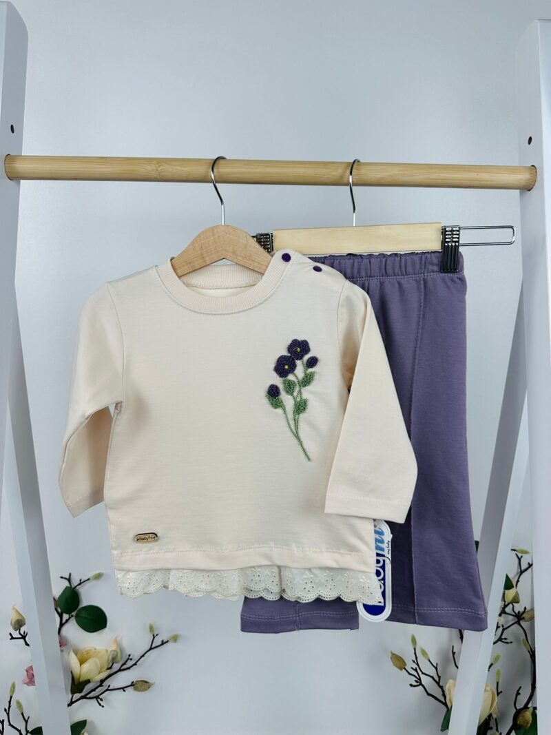 Моделът включва фина блузка с релефна цветна апликация и деликатна дантела в долната част, комбинирано с удобни панталонки. Това е перфектна комбинация за родители, които търсят балансирана визия – едновременно практична и елегантна.