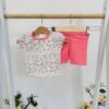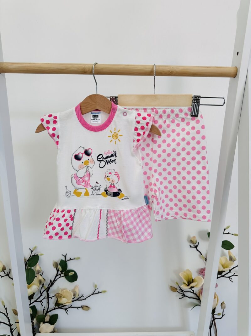 Събуди лятното настроение с този закачлив комплект, който грабва вниманието от пръв поглед! Горнището е с игрив принт на симпатични патета, допълнено с ефектни къдрици и весело съчетание от точки и каре. Късият панталон с цялостен десен на розови точки допълва визията с още повече настроение и удобство за всяко движение.