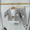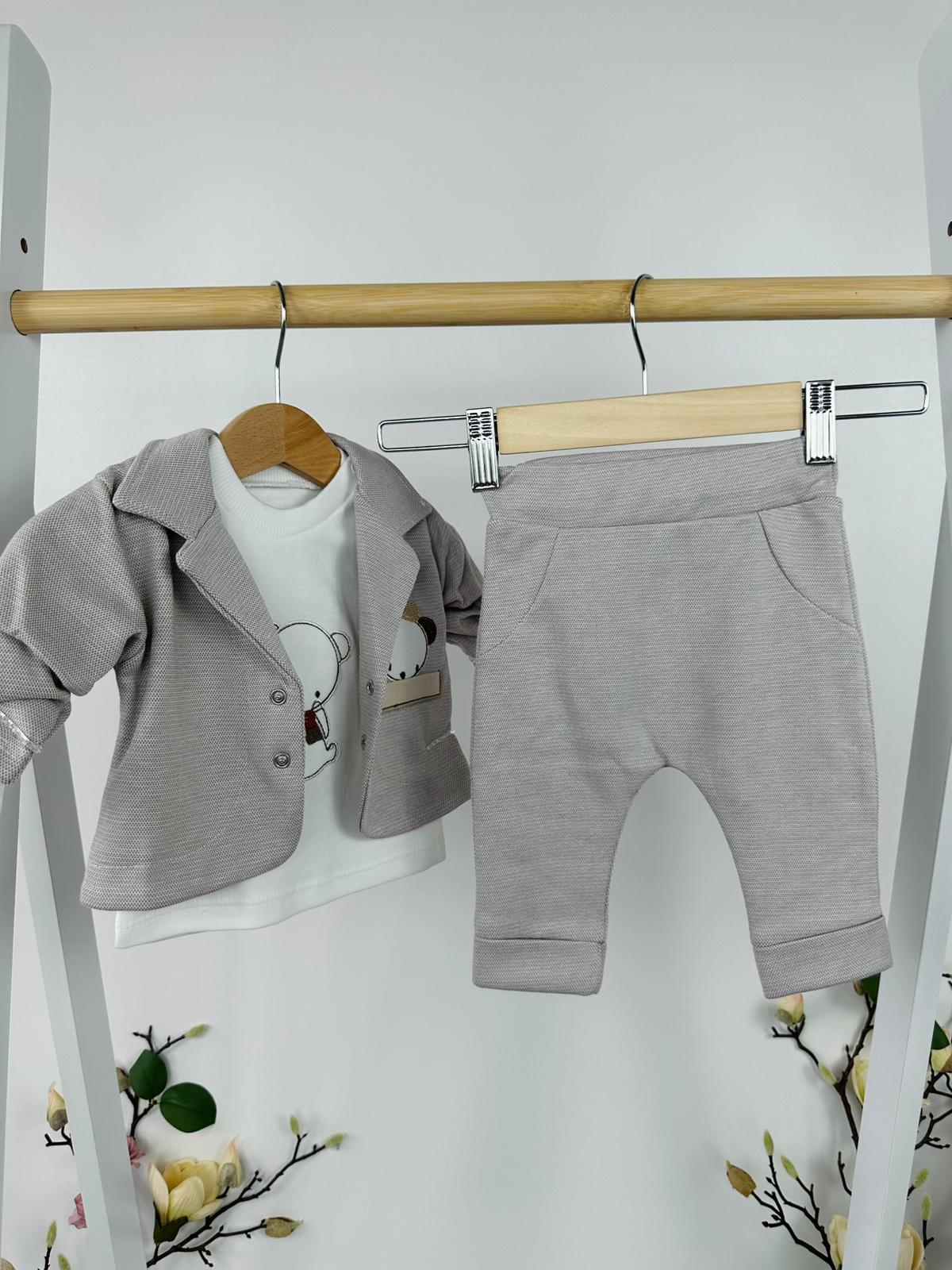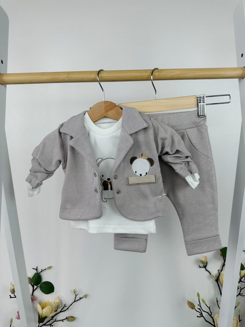 Още с първия поглед този комплект впечатлява с нежна елегантност и модерна визия, която прави всеки малък принц истински чаровник. Якето е с ефект на мини сако, допълнено от сладка апликация на мече, а блузката носи игриво настроение с щури мечета приятели. Панталончето е удобно, меко и идеално за целодневни приключения. 💫