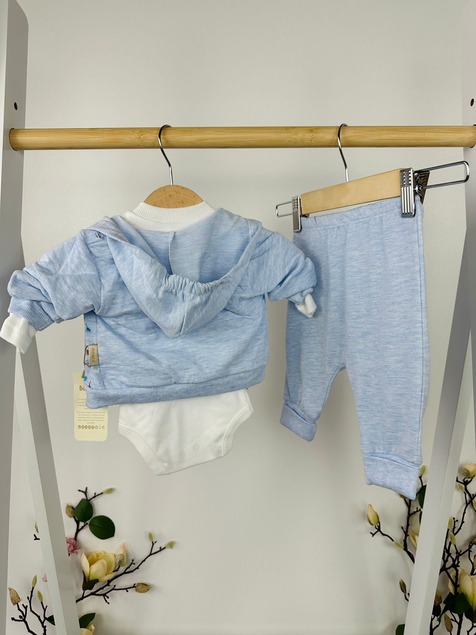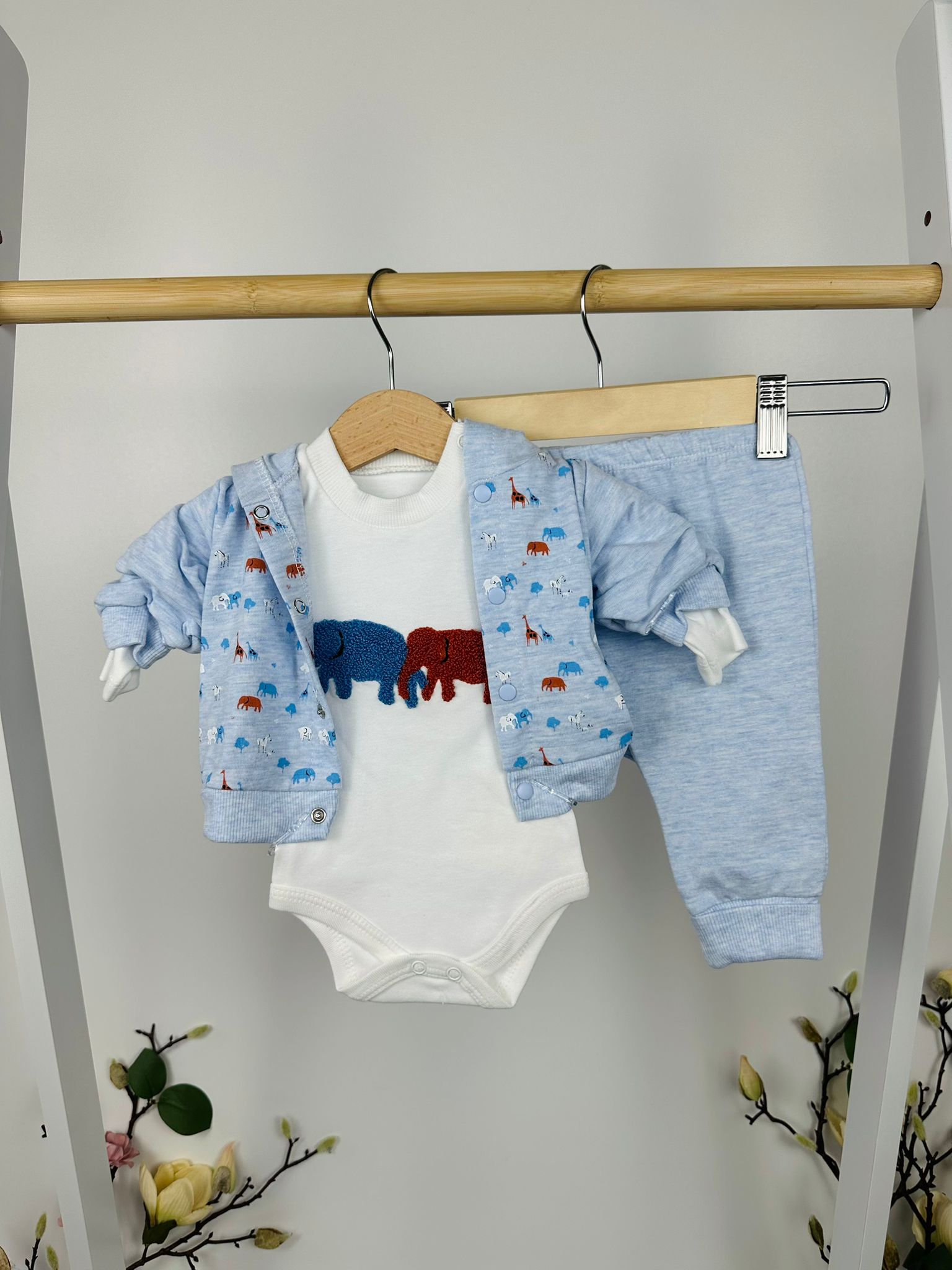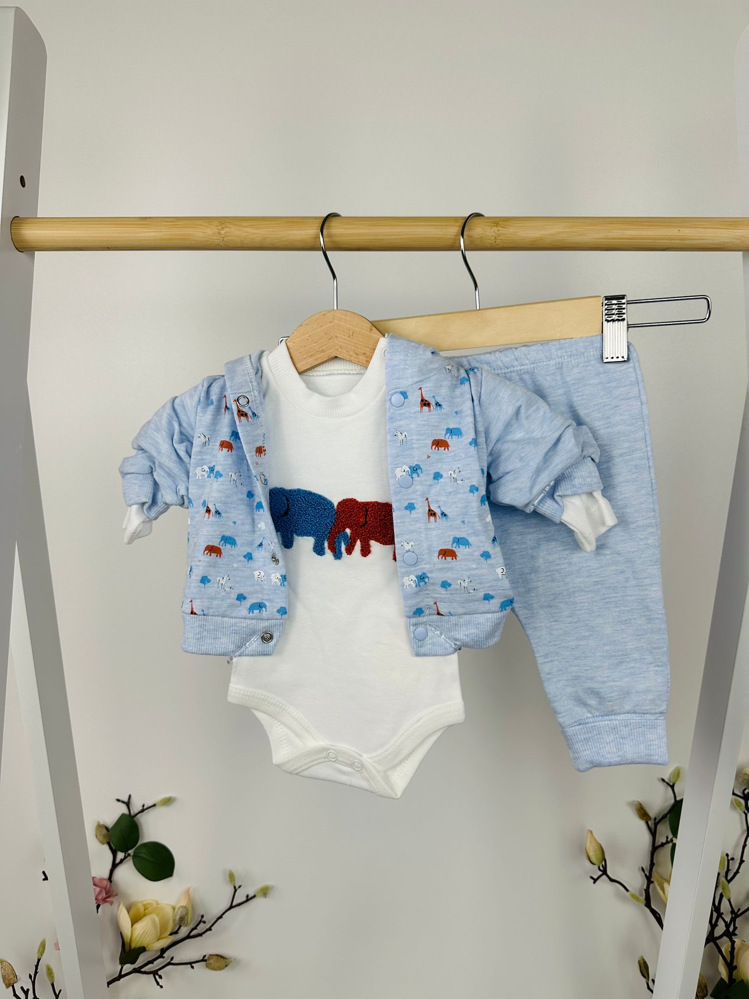 Очарователен комплект от три части с боди, долнище и горнище с животински мотиви и удобна качулка. Идеален за ежедневие, разходки и комфортни детски моменти. 🐘✨
