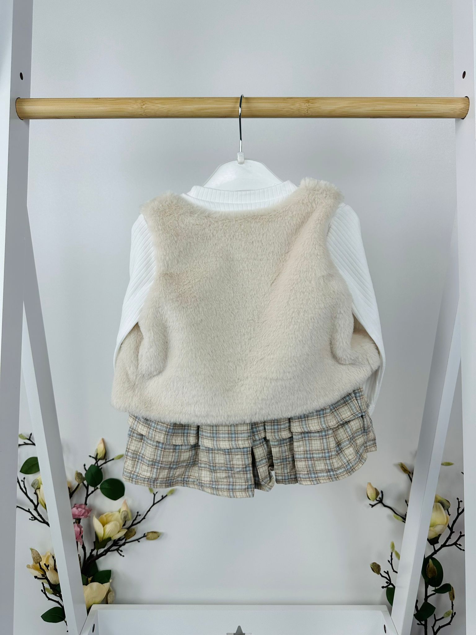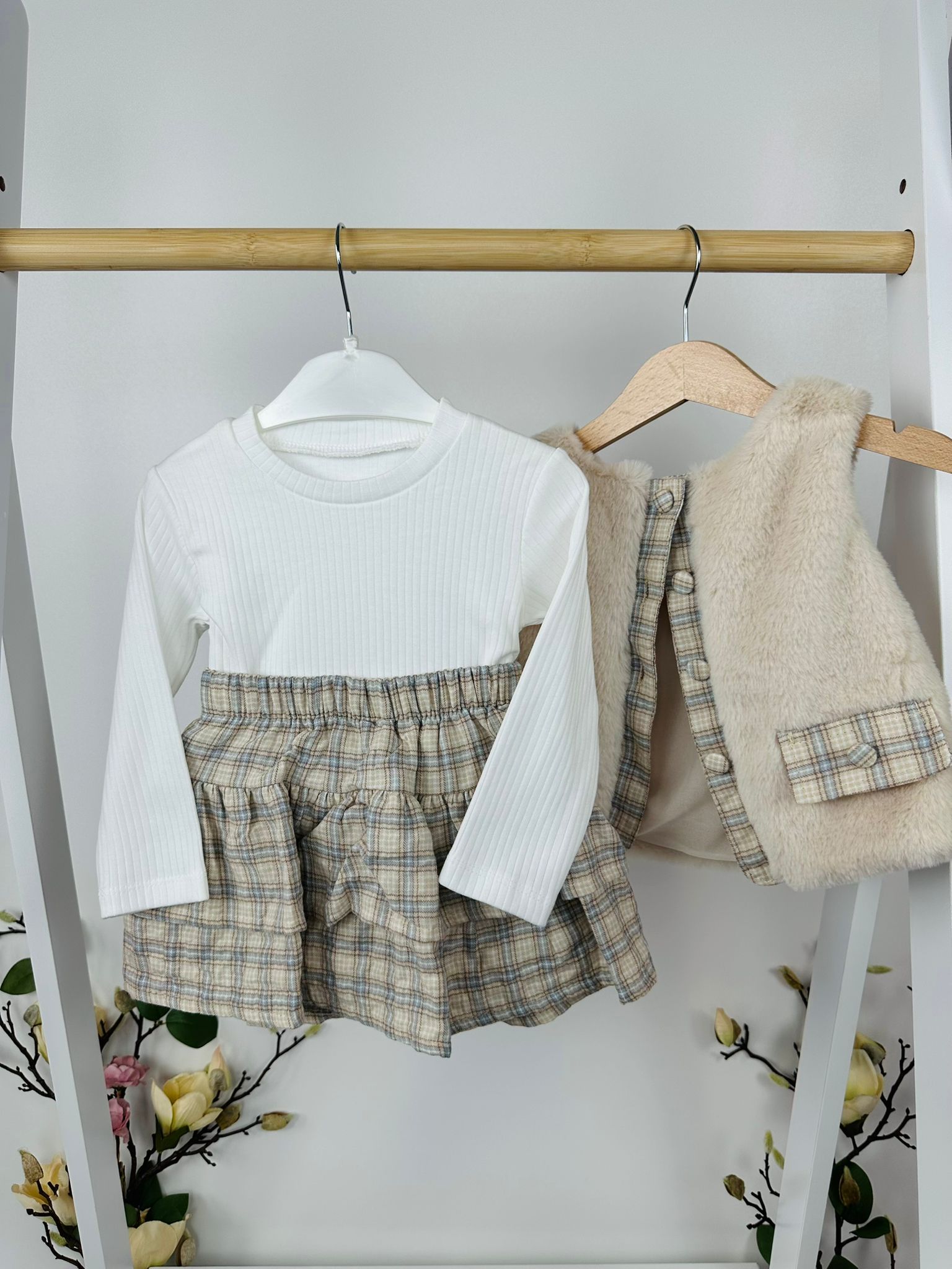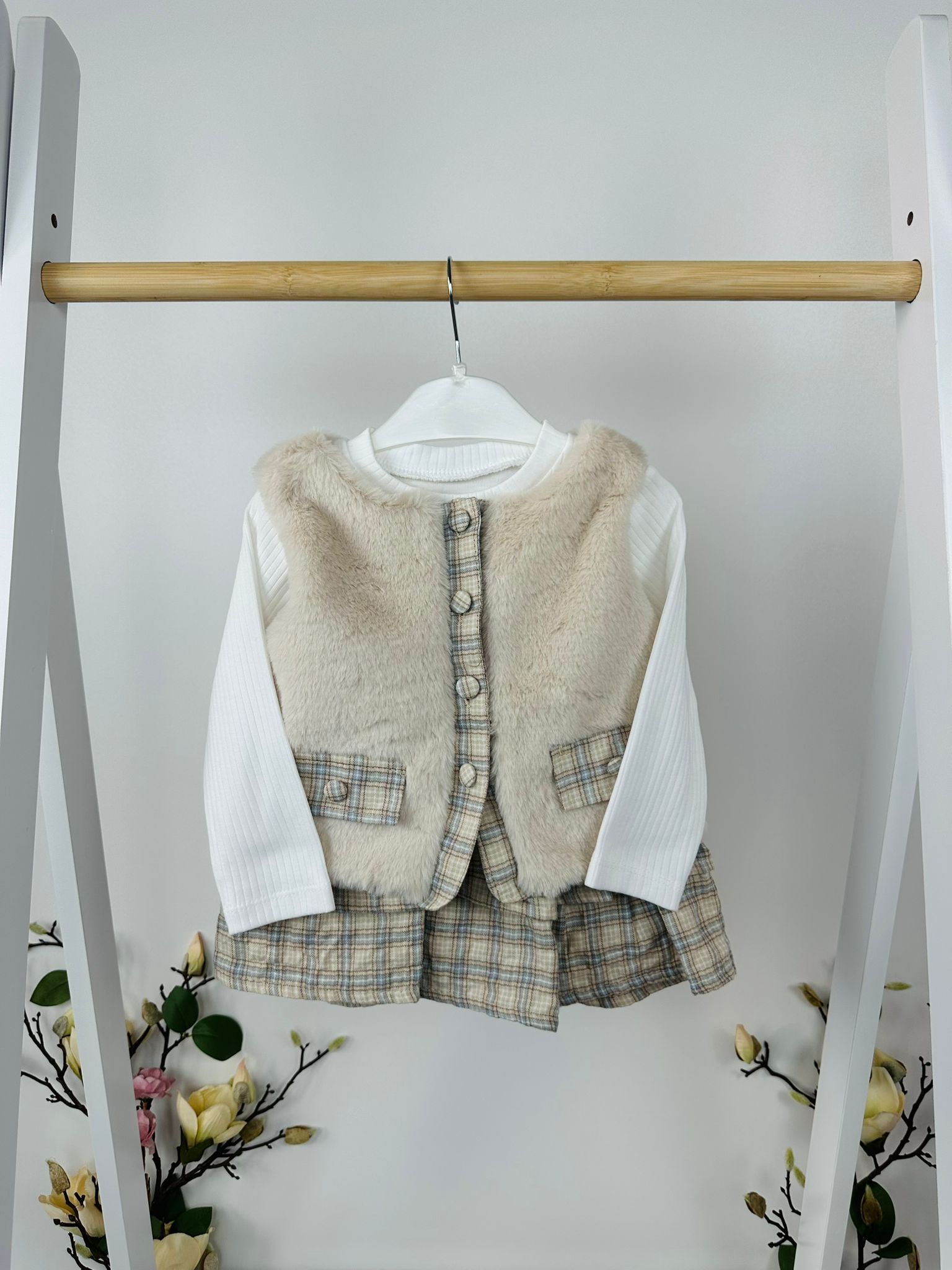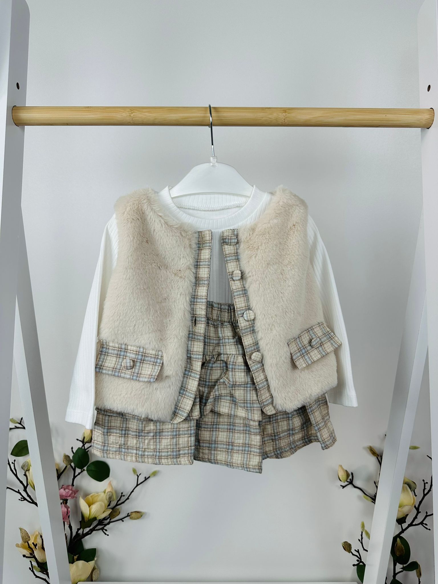 Комплектът включва блузка с изчистена линия, елегантна пола с нежен обем и мек елек, който допълва визията и придава завършен, стилен акцент. Частите са съчетани така, че да създават балансиран и елегантен силует без излишна претрупаност.