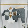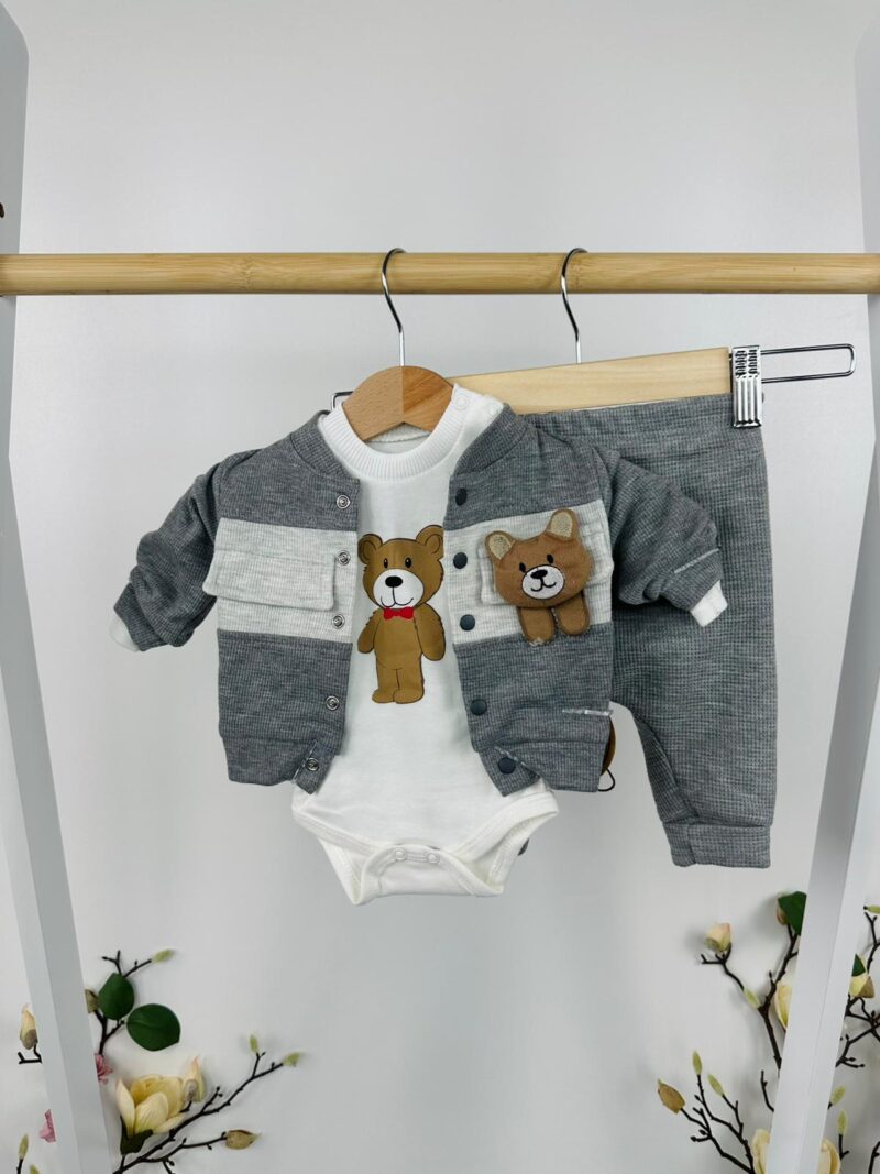 Очарователен и практичен комплект, създаден за малките господа, които обичат удобството и сладките детайли. Тройният сет включва мека боди-блузка, комфортно долнище и яке, което завършва визията с модерно и уютно излъчване. Апликациите на мечета отпред превръщат комплекта в истинско бебешко бижу.