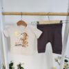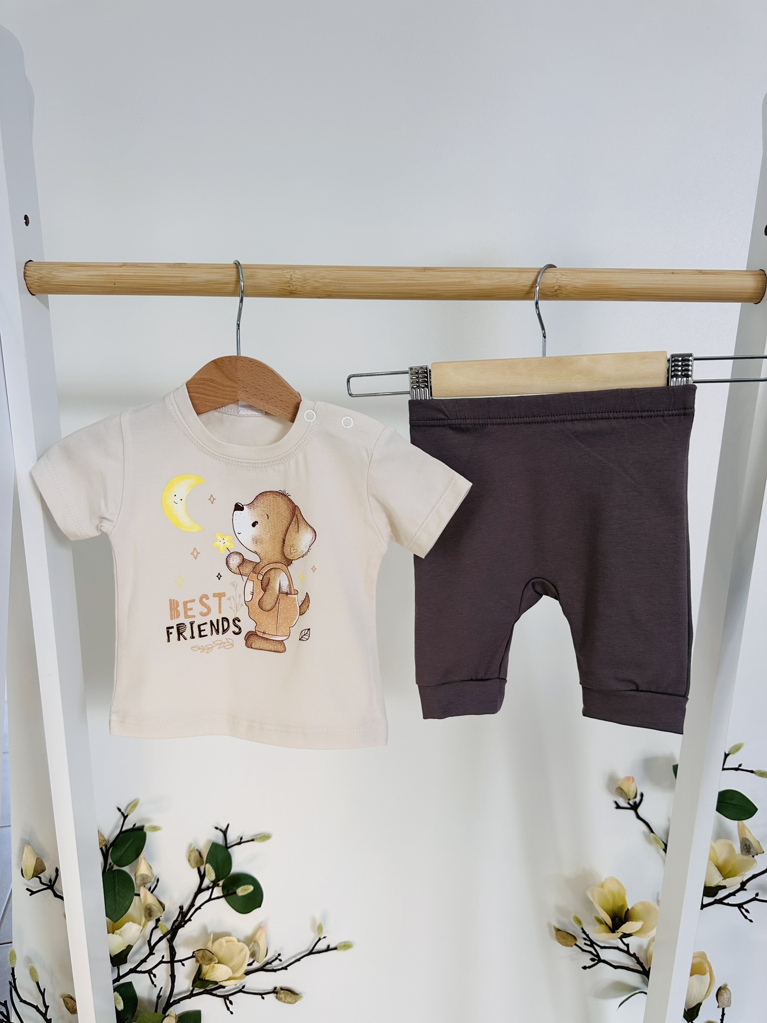 Сет, който излъчва нежност и спокойствие – идеален за малките моменти на близост и игра. Горнището е с мил принт на меченце и луна, носещ посланието „Best Friends“, а панталончето е в изчистен тъмен тон, който балансира визията. Удобна кройка и мека материя правят комплекта чудесен избор за всеки ден.