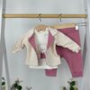 Комплектът включва блузка с очарователен принт, меко горнище с декоративни ревери и панталон с удобна кройка. Дизайнът е практичен и подходящ както за ежедневни разходки, така и за по-специални поводи, когато търсиш нещо нежно и стилно 🌷