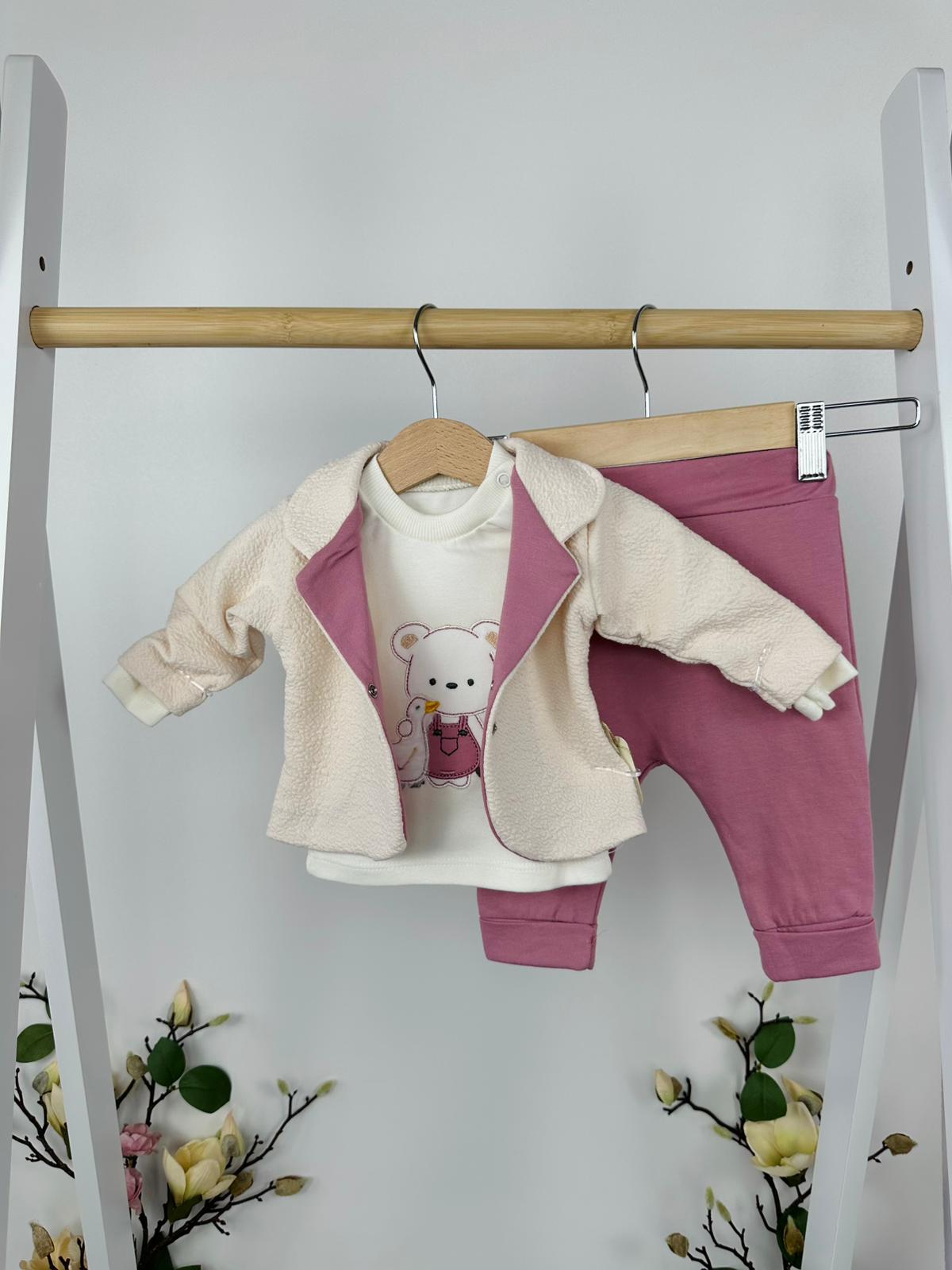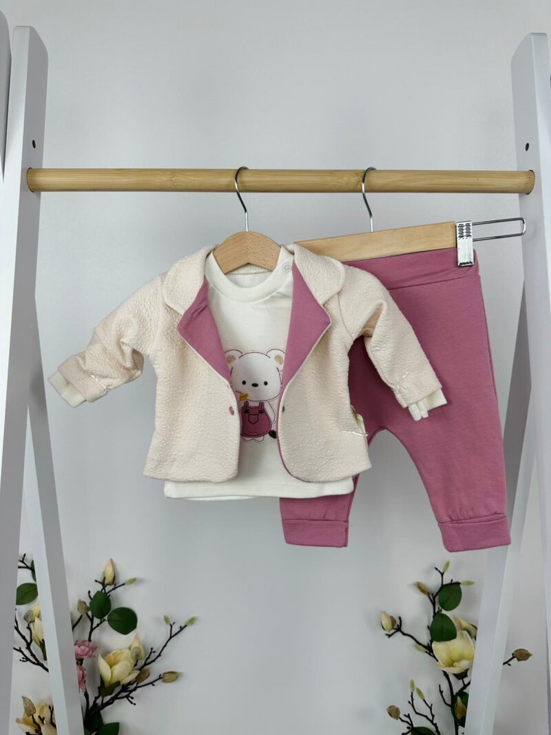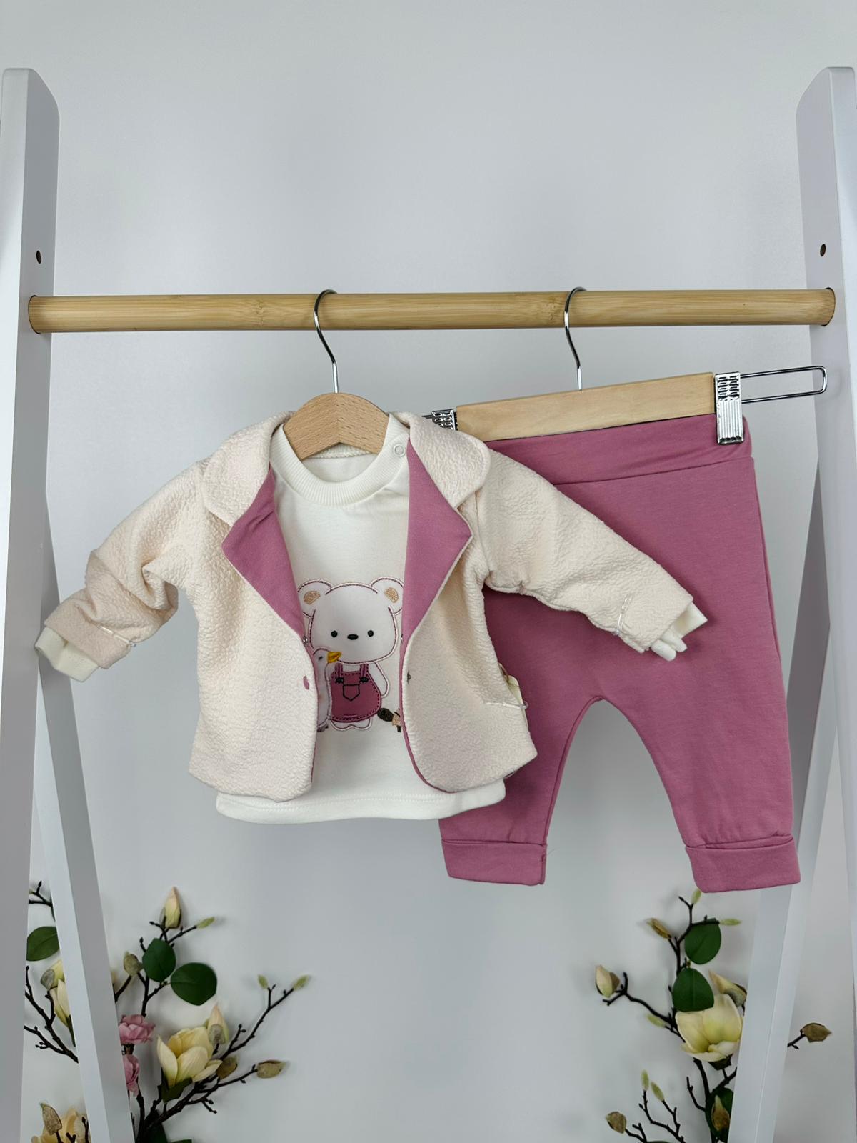 Нежен и уютен комплект от три части, създаден с внимание към детайла и комфорта на най-малките. Хармоничното съчетание на меки тонове и сладка апликация с мече придава топло и мило излъчване 🤍