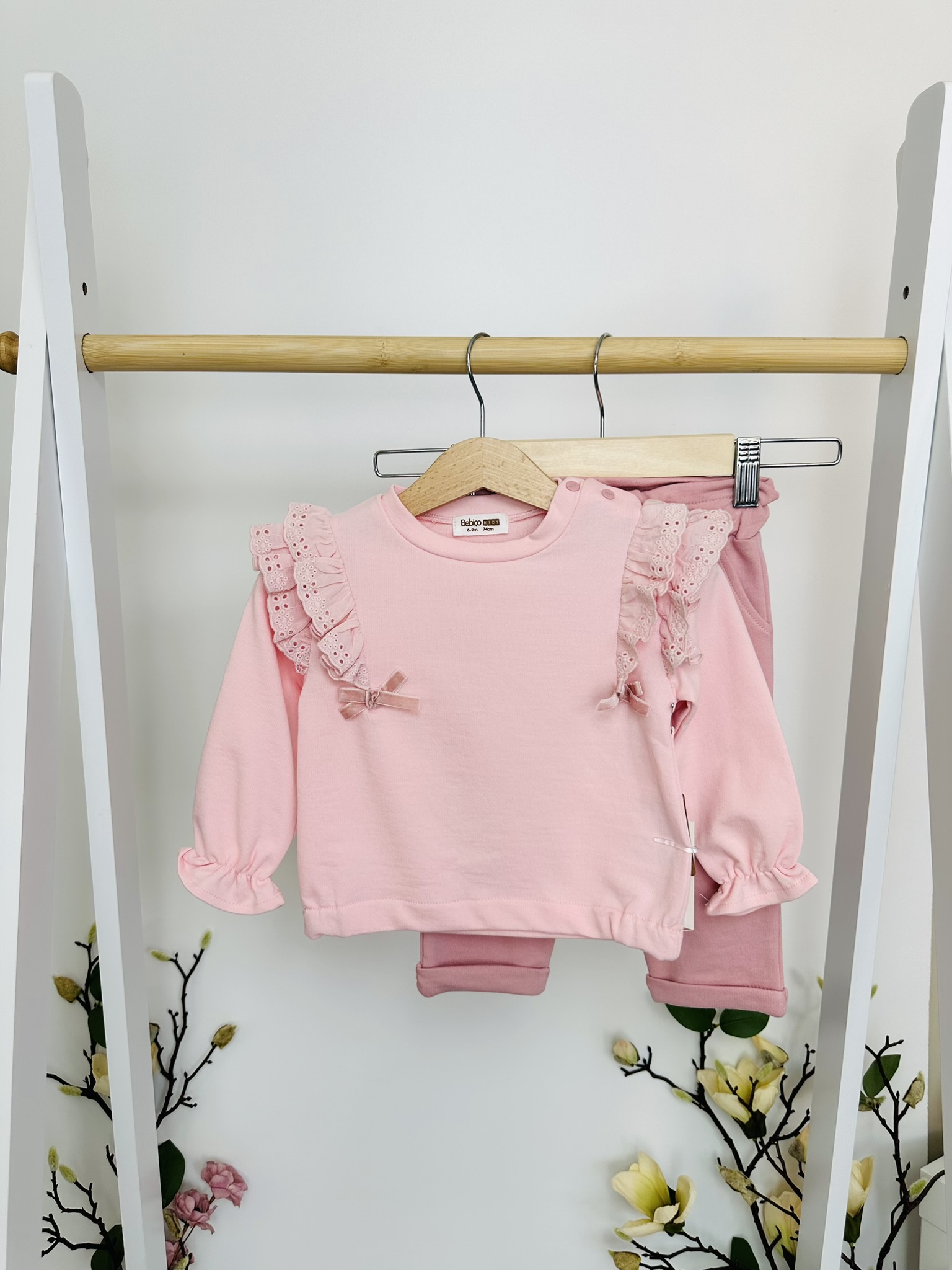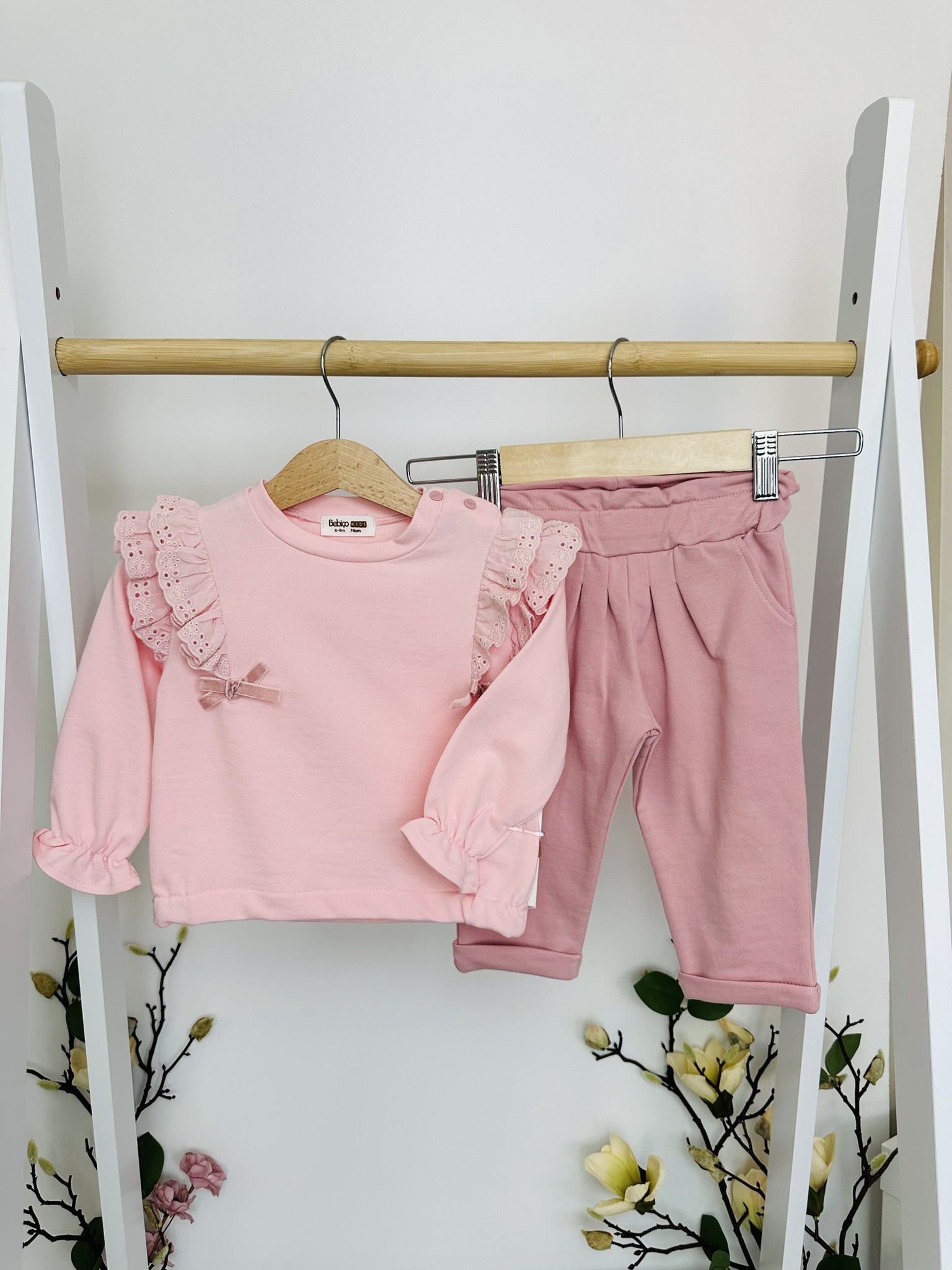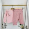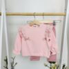Горната част впечатлява с фини къдрици, закачливи панделки и красиви ръкави с ластични елементи, придаващи романтична нотка. Долнището е с модерна кройка, подходяща както за ежедневие, така и за по-официални поводи. Еластичната талия осигурява комфорт през целия ден, а мекият текстил позволява свобода на движението и лекота при обличане.