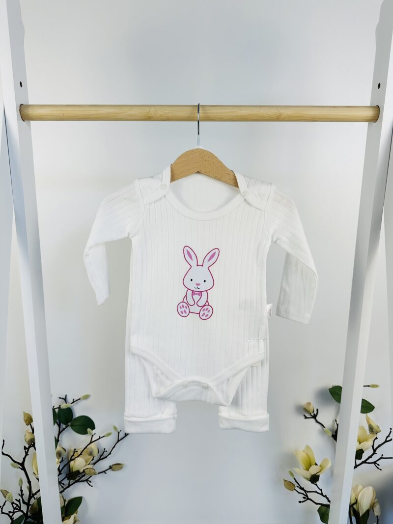 Този сладък комплект от боди и панталонче е идеален за най-малките – мек, практичен и изключително мил на вид. Бодито е с рипсена текстура и щампа на усмихнато зайче, а панталончето допълва визията с комфортна кройка и топло излъчване. Подходящ както за ежедневието у дома, така и за разходки или първи снимки.