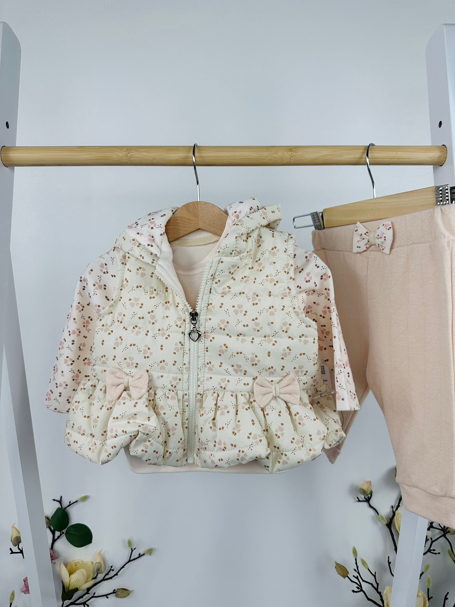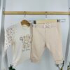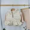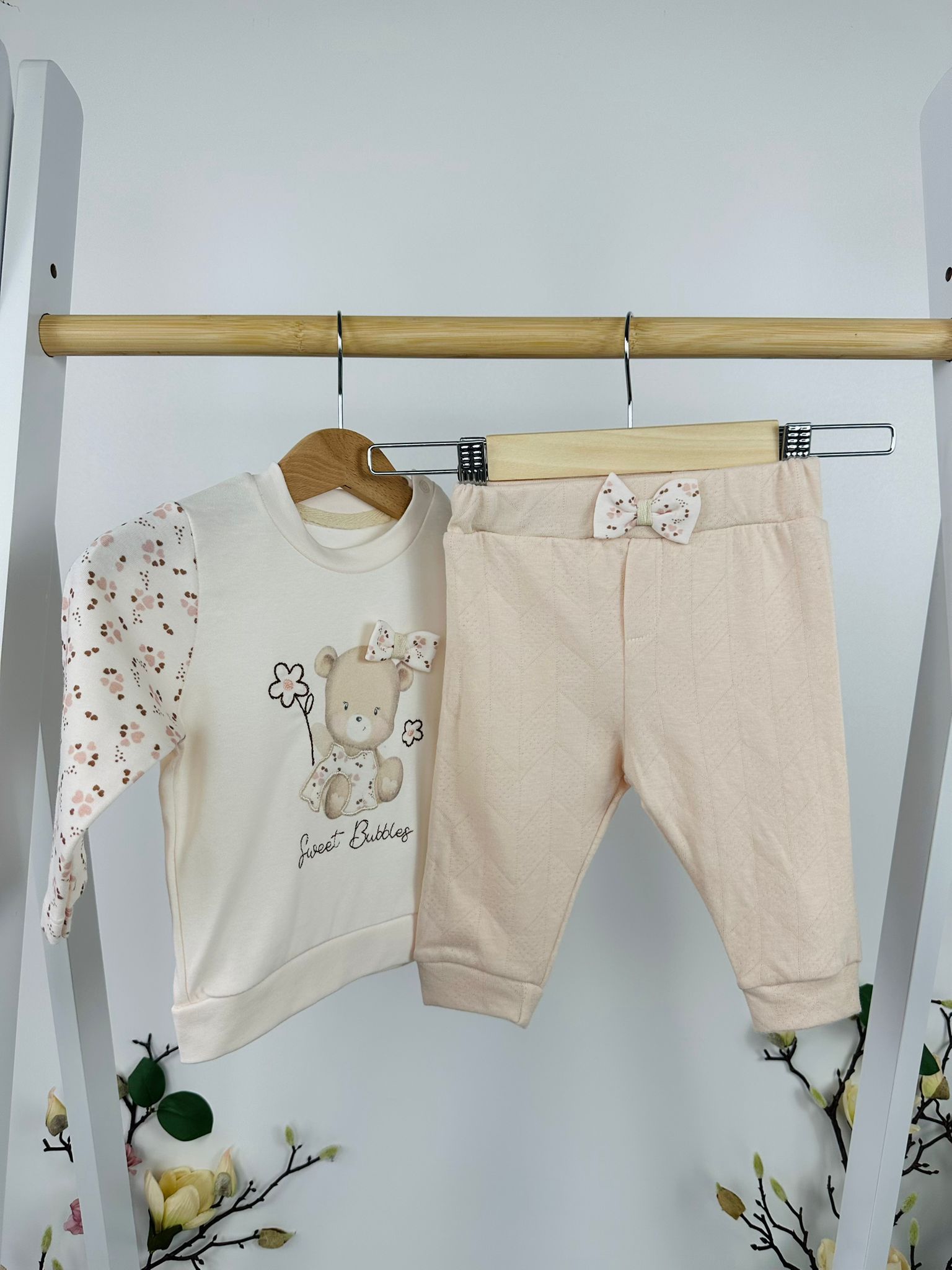 Моделът впечатлява с пухкаво горнище с флорални мотиви и панделки, мека блузка с апликация на мече и панталонки с релефен дизайн. Комбинацията от сладки акценти и удобна кройка прави комплекта идеален за разходки, игри и ежедневни приказни моменти.
