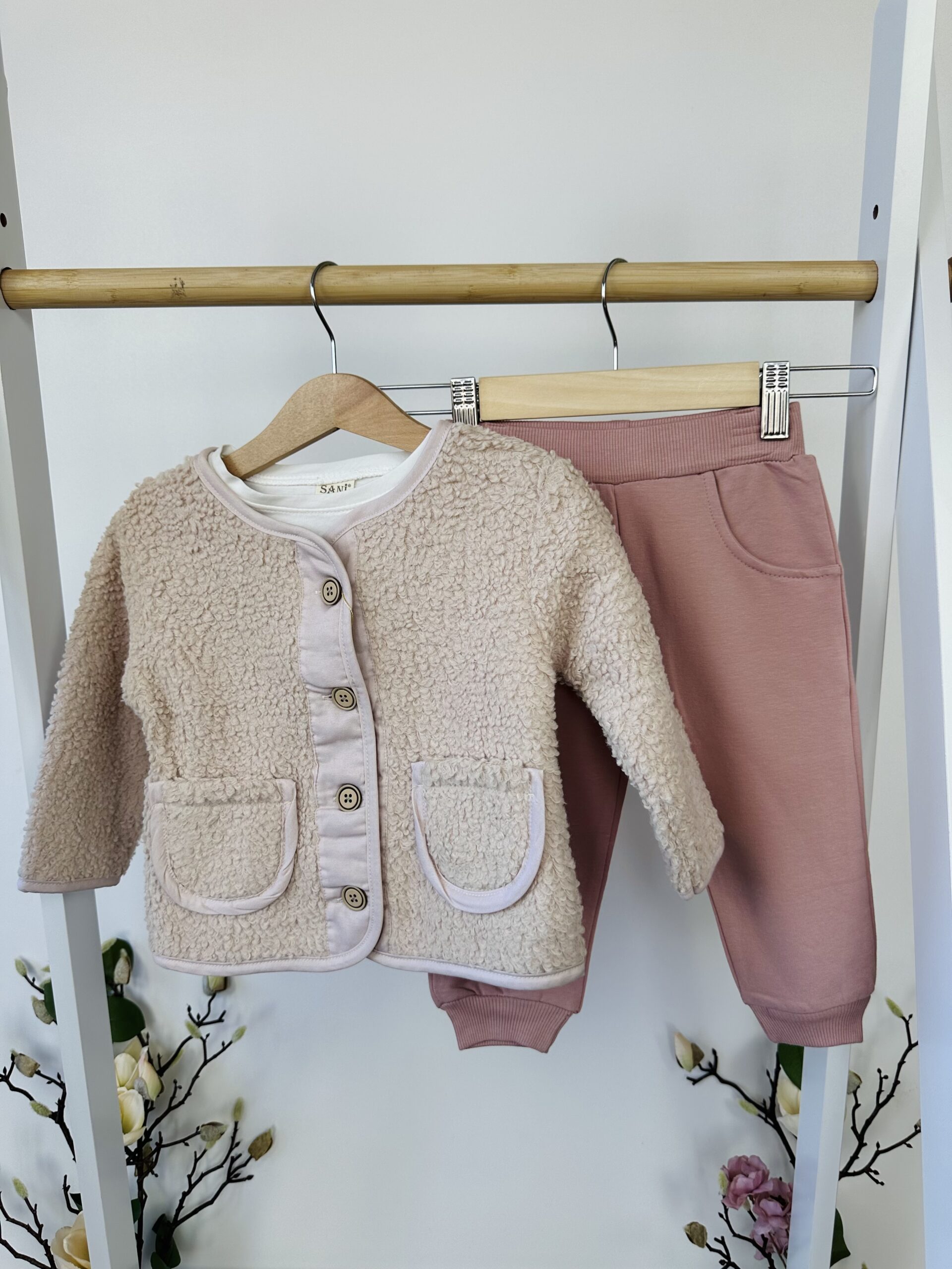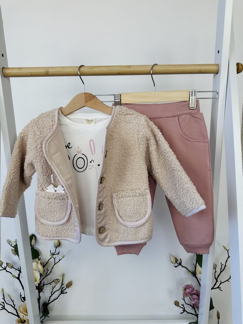 Този нежен и уютен комплект е създаден за активни дни, в които малката дама иска да се чувства свободно, но и да изглежда стилно. Състои се от три части, които могат да се комбинират заедно или да се носят поотделно, в зависимост от сезона и повода.