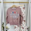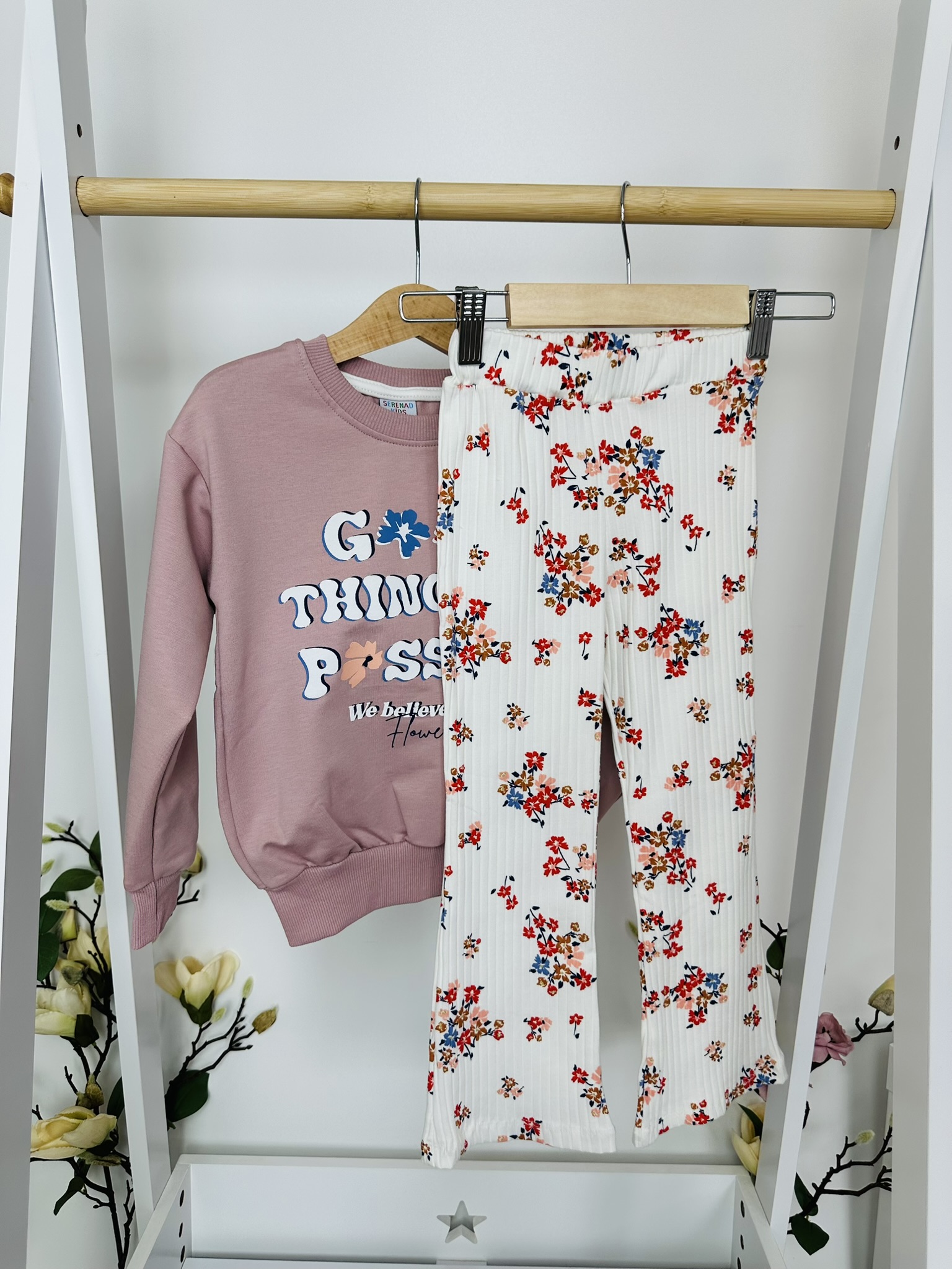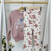 Този комплект излъчва положителна енергия и свежест. Горнището с надпис „Good things are possible“ носи вдъхновяващо послание и е допълнено с нежни цветни акценти. Панталонът с флорален принт върху релефна основа създава настроение и завършва визията с ефирен дух. Идеален за игри, разходки и слънчеви усмивки.