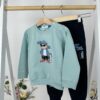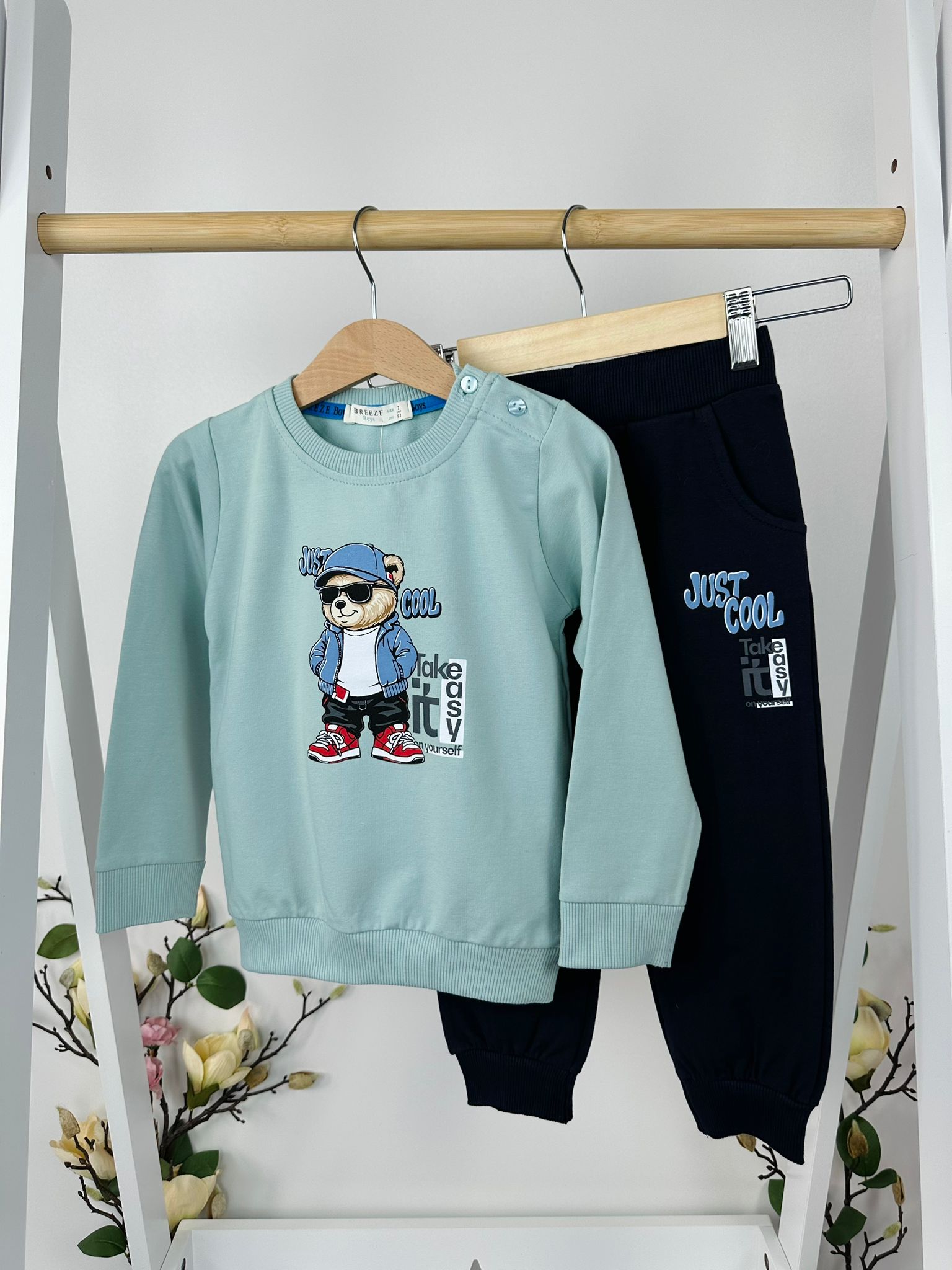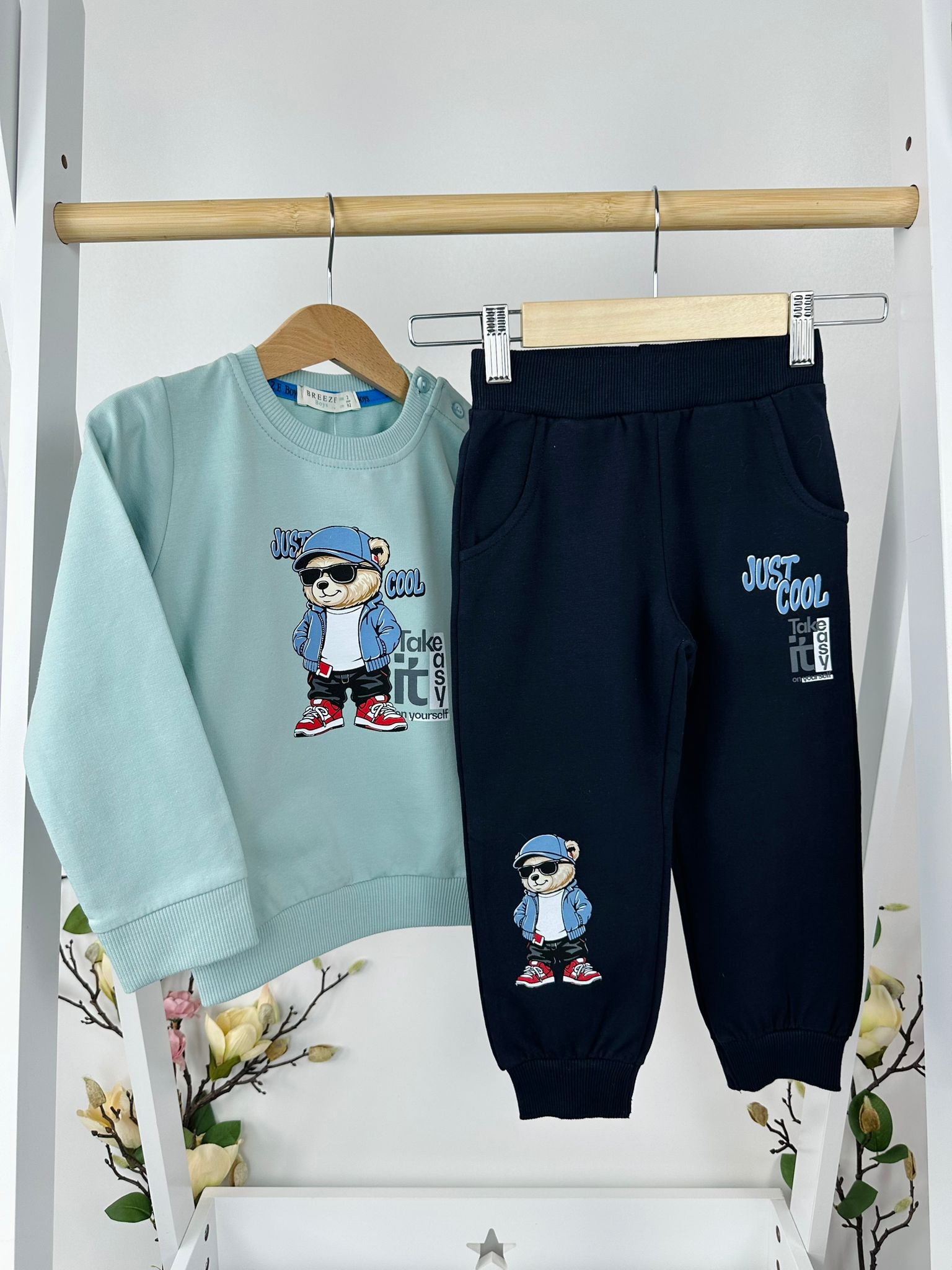 Комплектът включва блуза с дълъг ръкав и панталон, създадени да осигурят свобода на движение и практичност през целия ден. Акцентът пада върху атрактивната щампа с мече и надписи, която придава модерен и закачлив характер. Блузата е с класическа кройка, а панталонът е с удобна талия и завършени крачоли за стабилно прилягане.