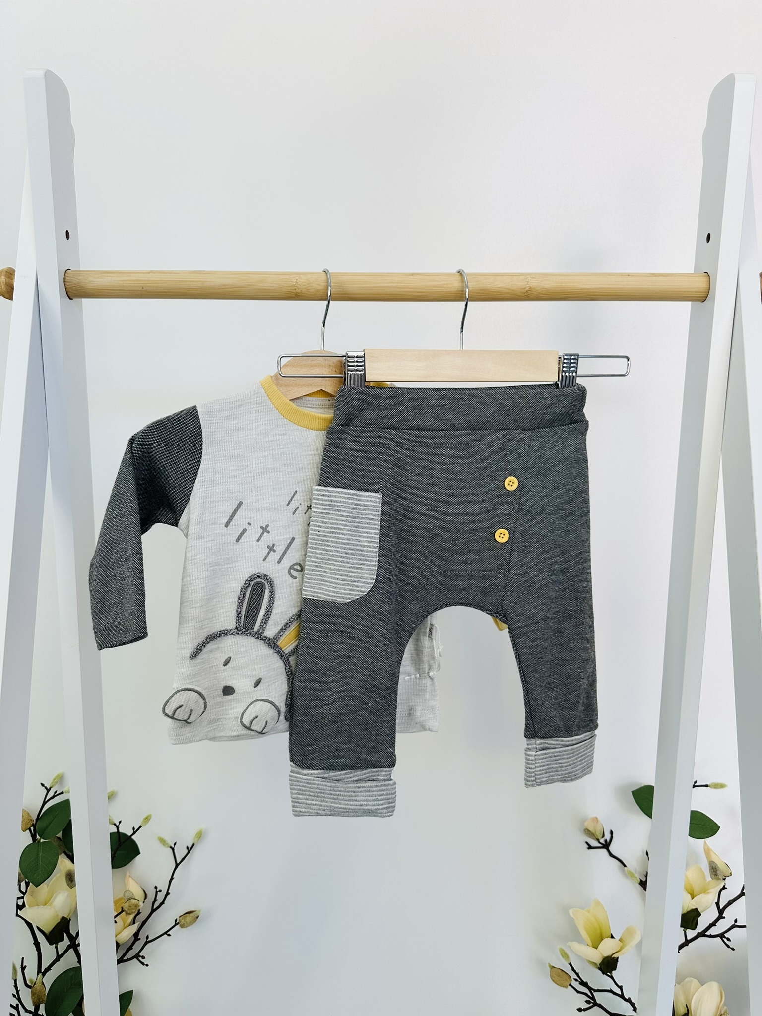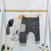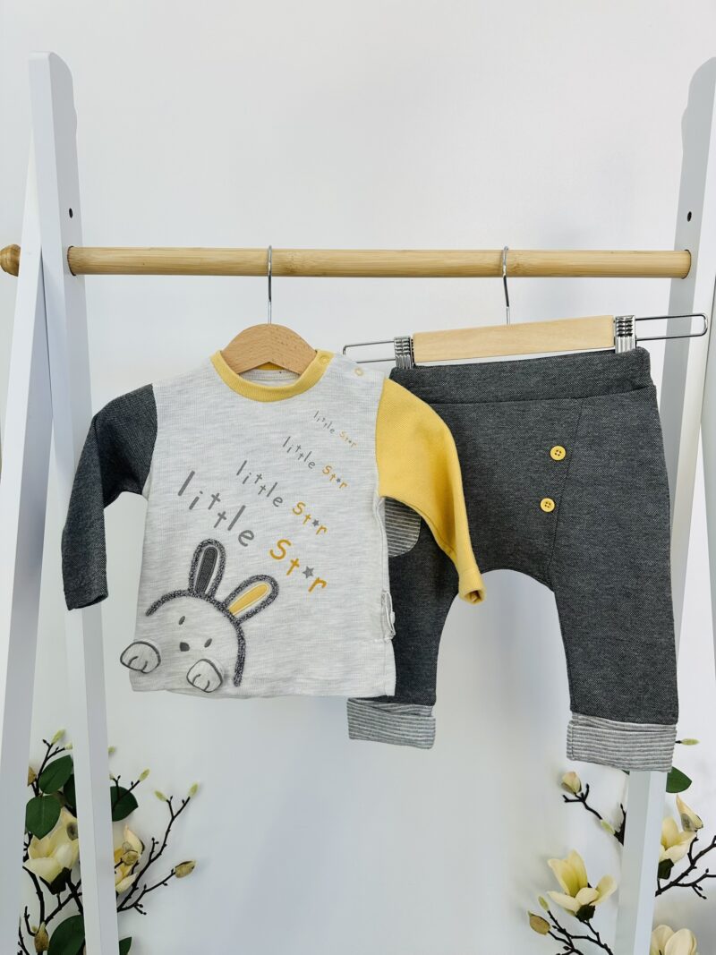 Очарователен и удобен комплект за малките звездички у дома! Горнището с апликация на зайче и цветни надписи „Little Star“ придава закачлив вид, а ръкавите в различни цветове добавят игрив акцент. Панталончето с декоративни копченца и подгънати крачоли е прекрасно допълнение към визията и осигурява комфорт през целия ден.