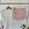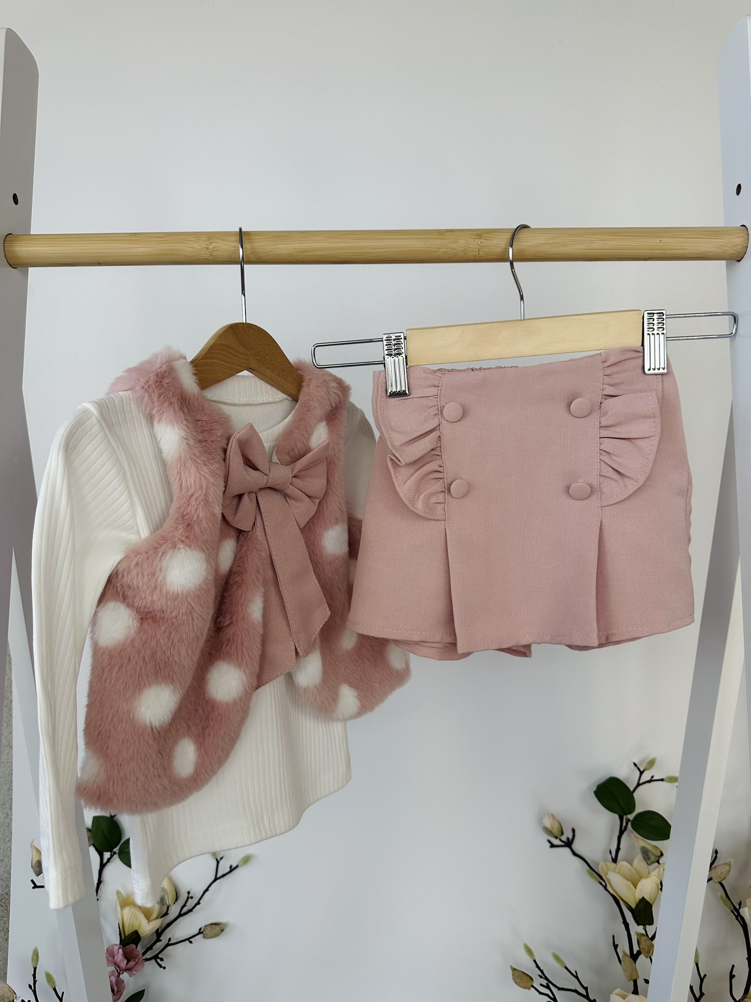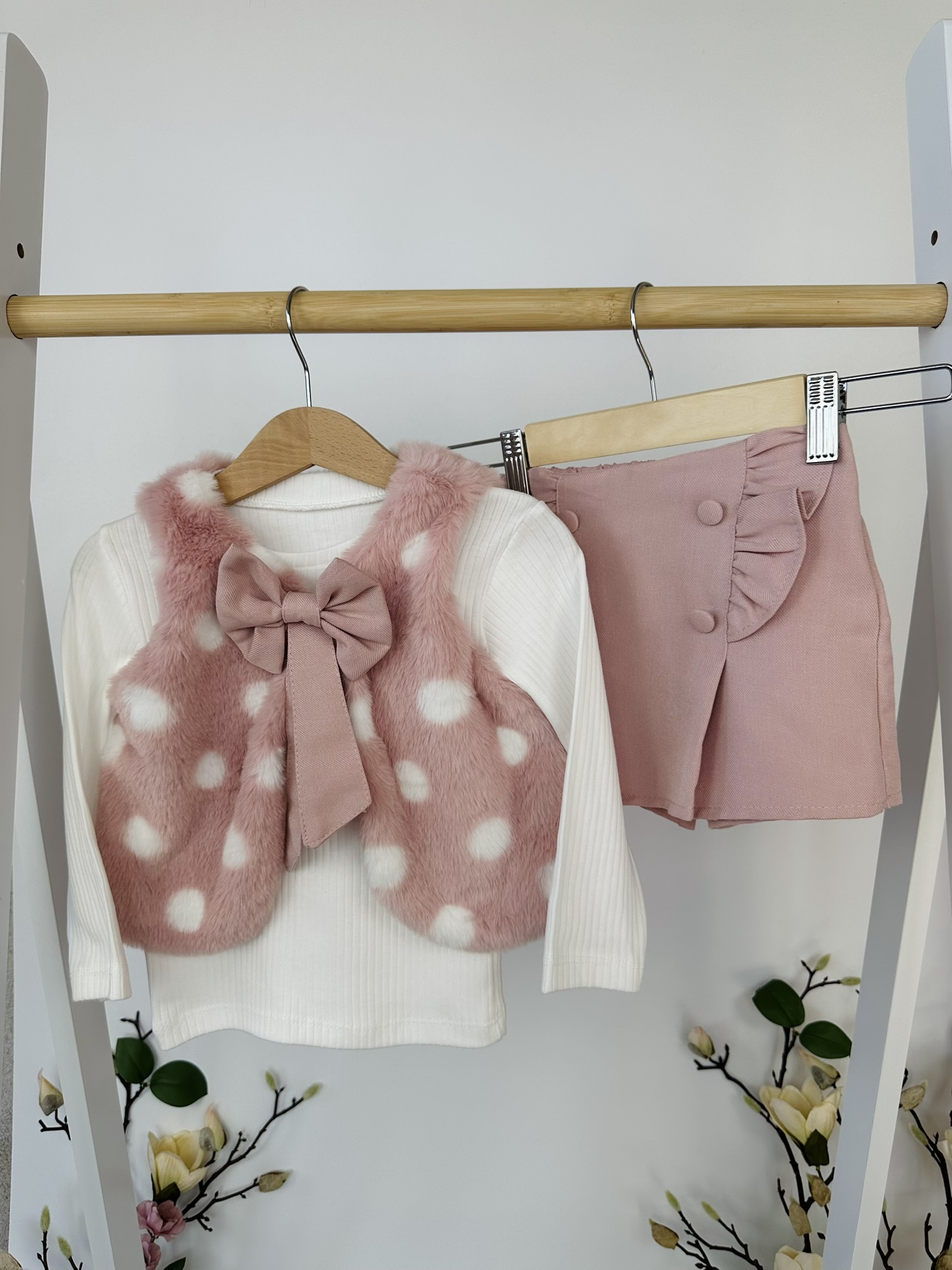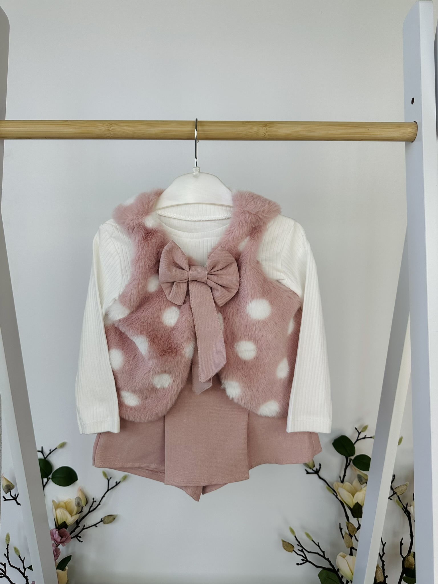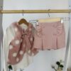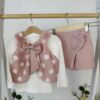 Нежен и очарователен комплект от три части, който съчетава елегантност и комфорт. Състои се от фина блузка, пола-панталон с къдрици и пухкав елек с голяма панделка — перфектна комбинация за малки дами с вкус към стила.