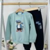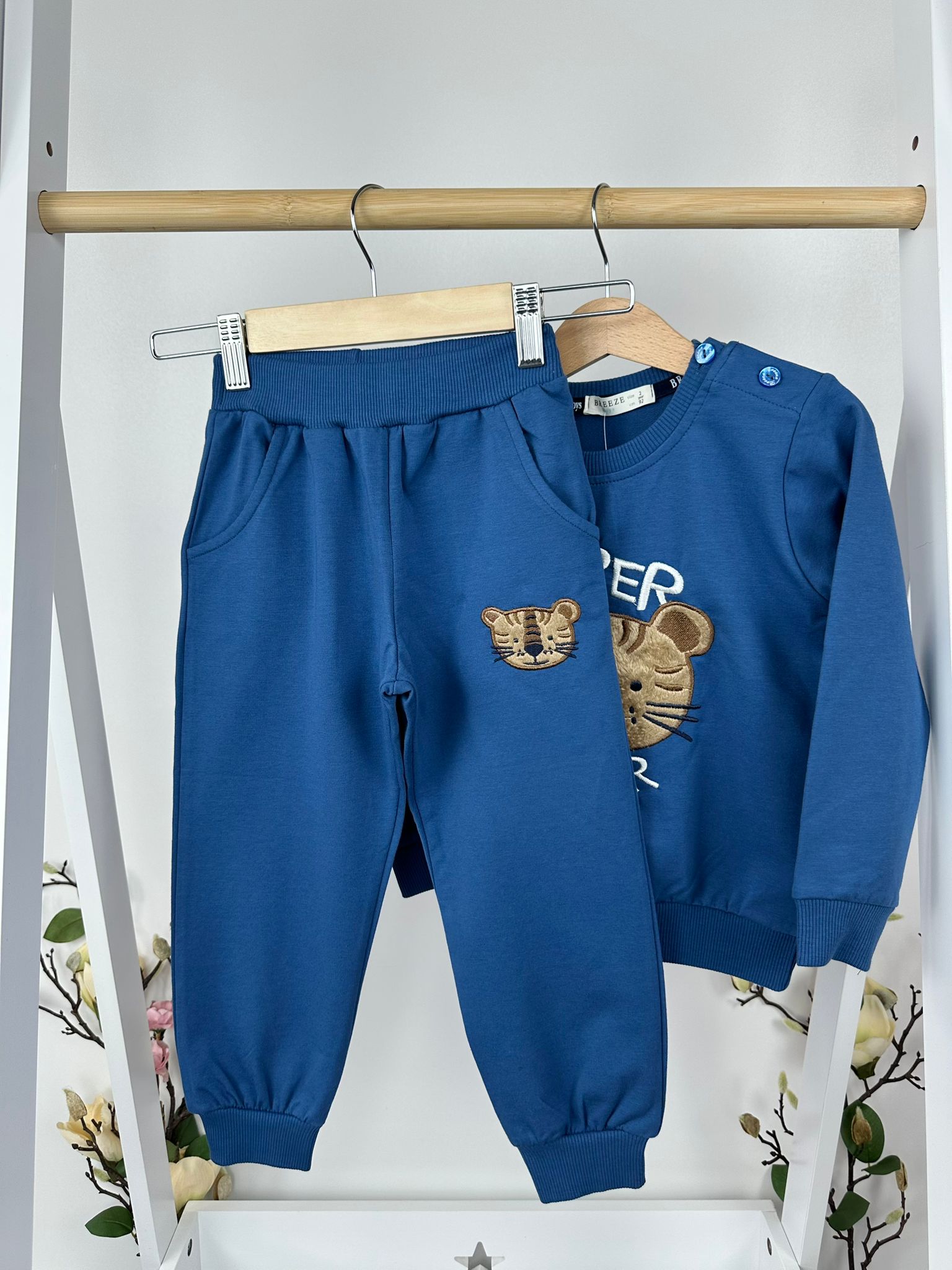 Комплектът включва блуза с дълъг ръкав и долнище, които се допълват перфектно както визуално, така и функционално. Блузата е с акцентна апликация тигърче и надпис, а долнището е с удобна талия и допълващ детайл. Подходящ избор за ежедневието, разходки и детска градина.