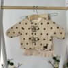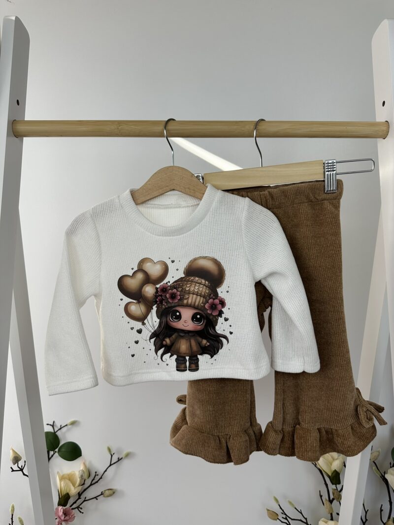 Очарователен комплект, който съчетава топлина и стил в едно! Меката блузка с красиво момиченце и балони създава приказно настроение, а рипсените панталонки с къдрички и панделки придават изтънчен и игрив вид.