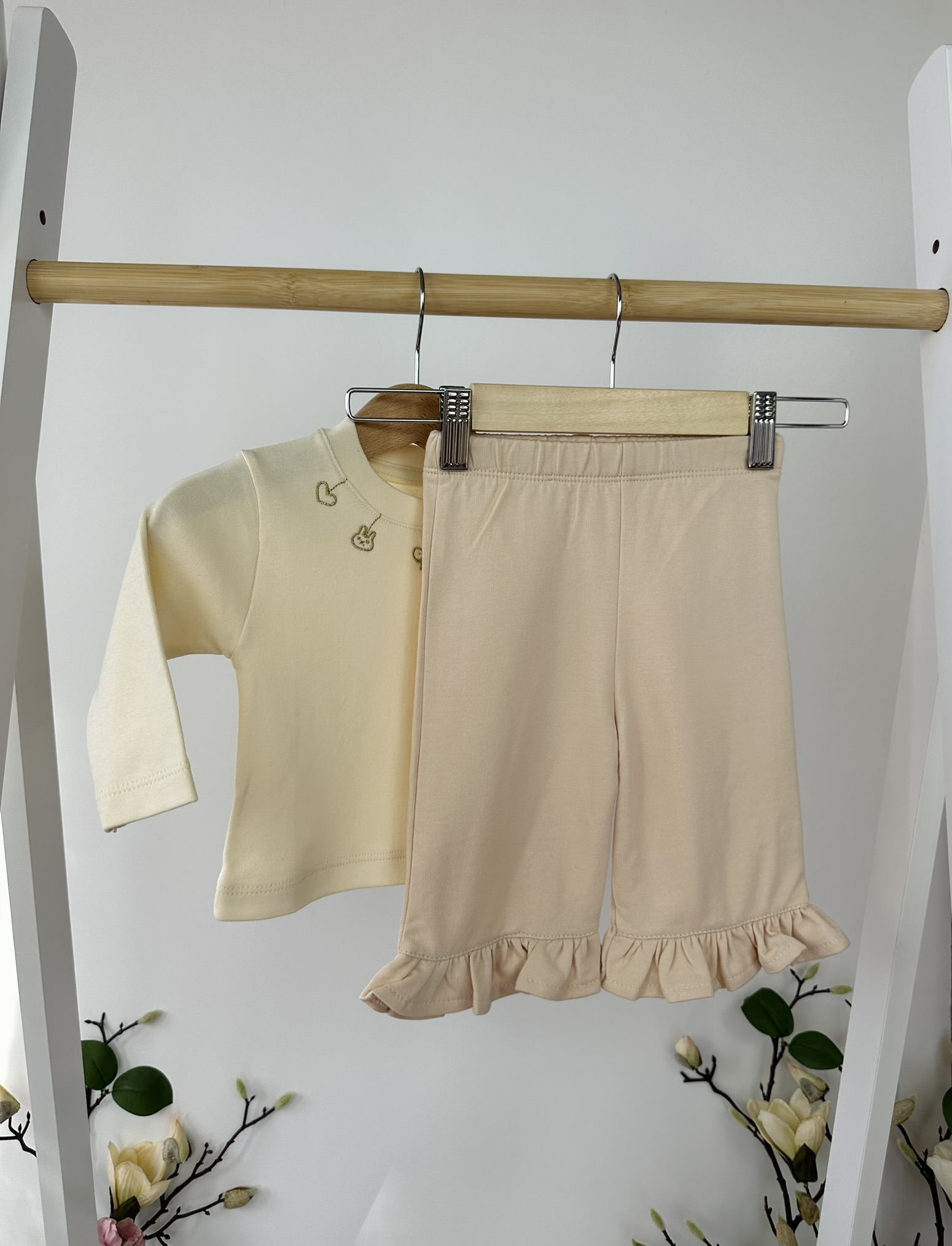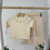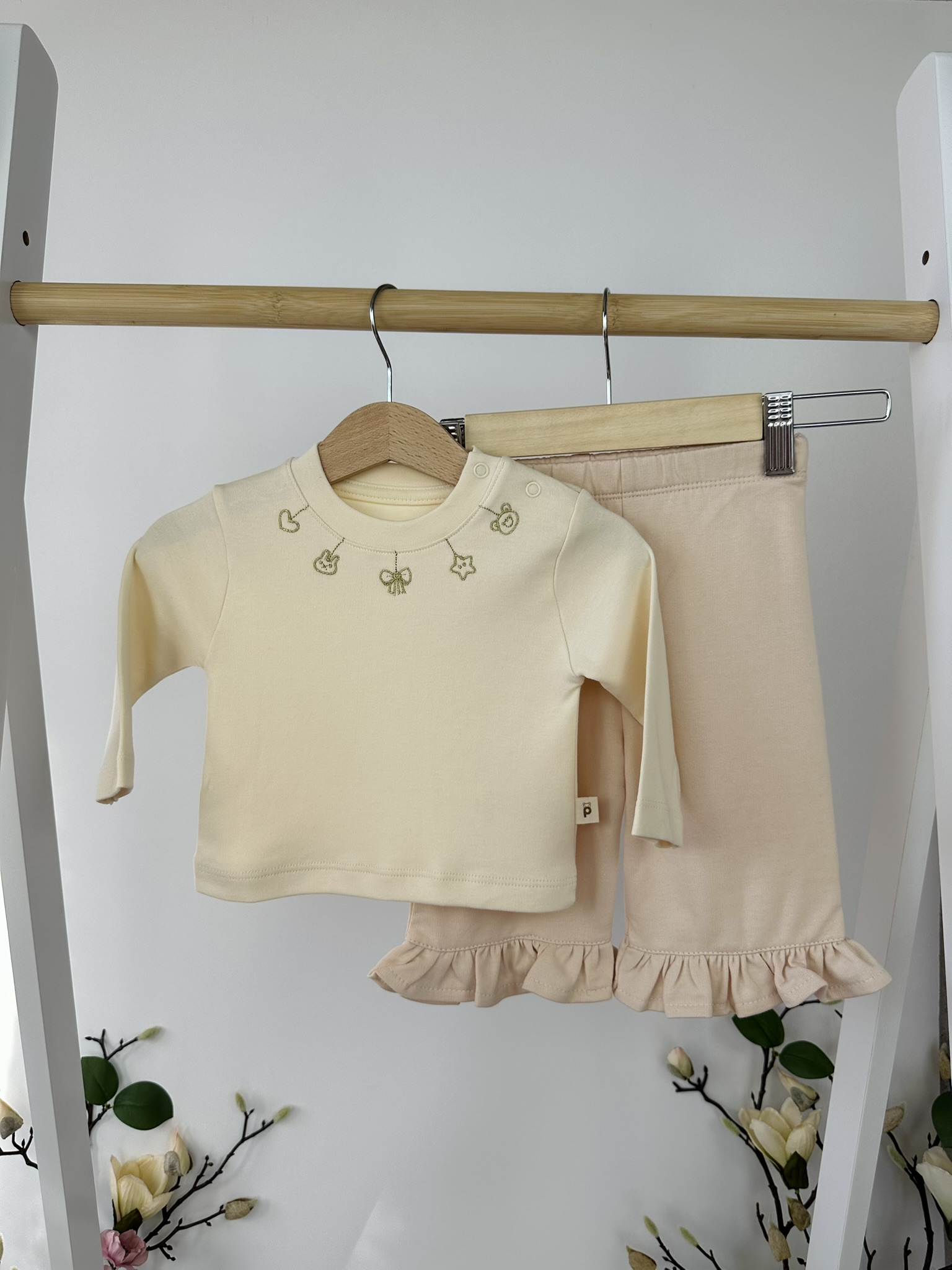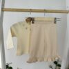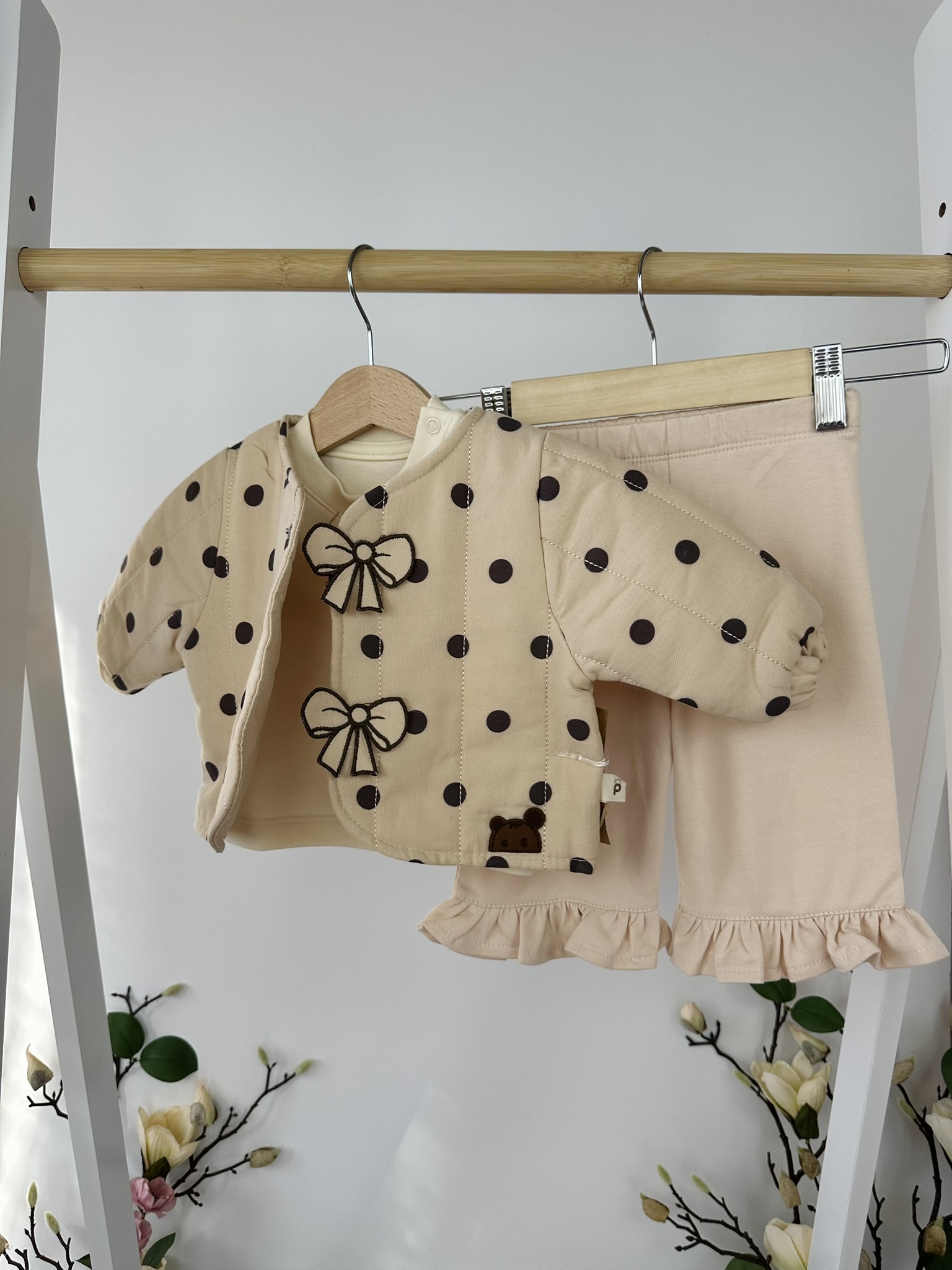 Нежен и уютен комплект от три части, който ще внесе чар и комфорт в ежедневието на вашето мъниче. Включва мека блузка с фини бродерии, панталонки с къдрички и пухкаво яке на точки с апликация на панделка и сладко мече. Перфектен избор за разходки и игри в по-хладните дни.