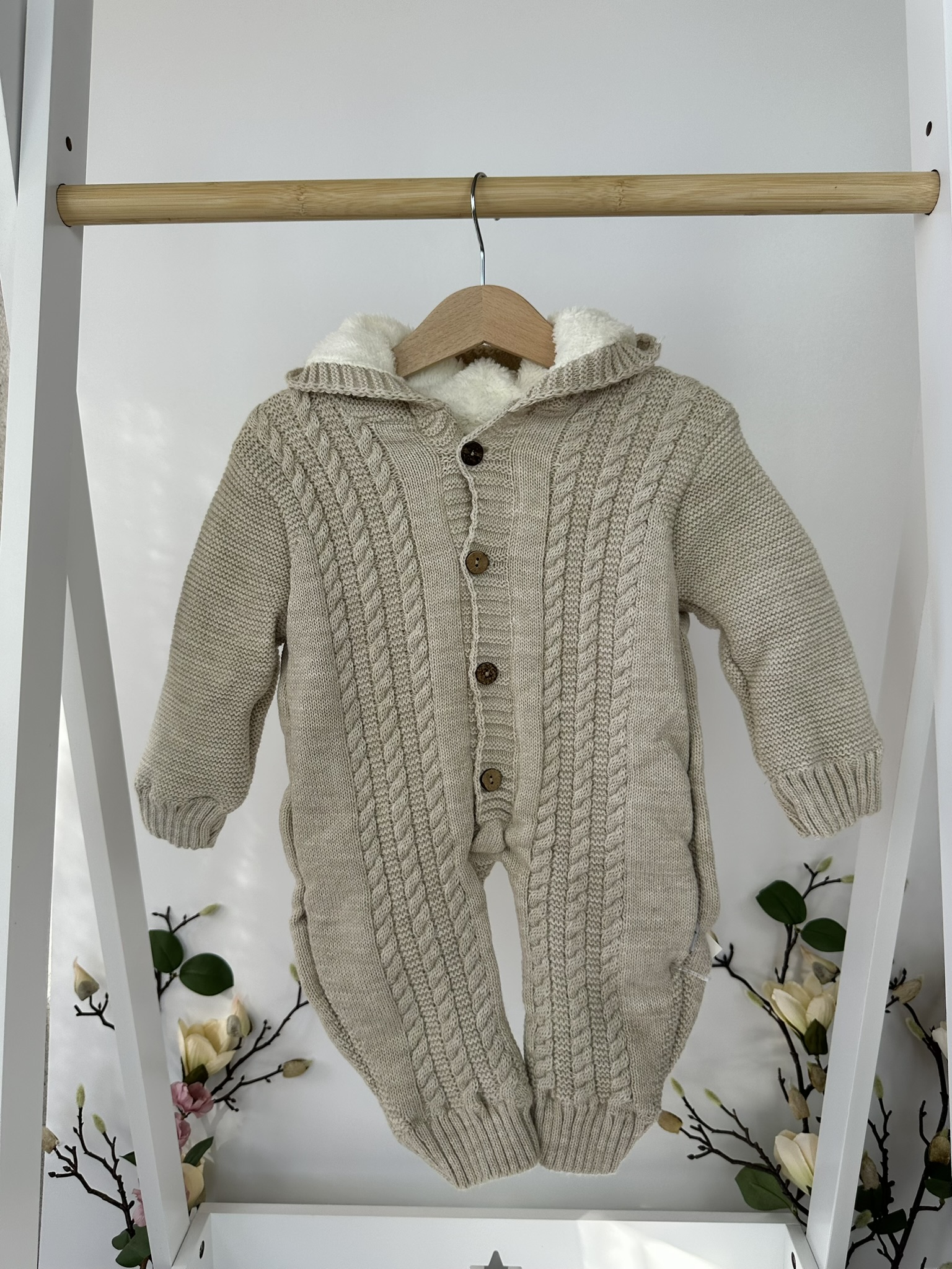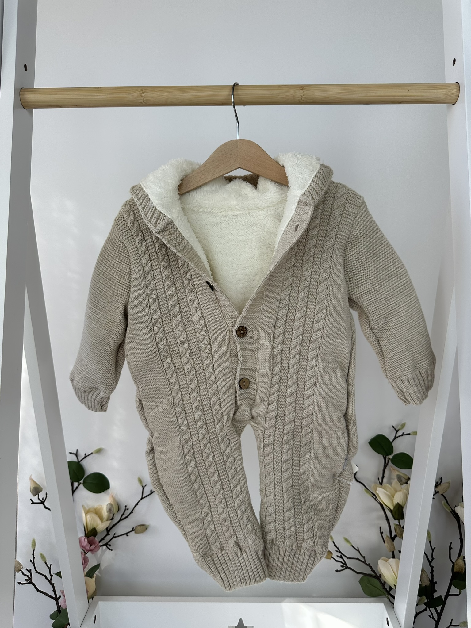 Изключително нежен и стилен плетен космонавт, създаден за уют и топлина в студените дни. С красив релефен дизайн и мека подплата, той осигурява комфорт и защита за вашето бебе от първия миг навън.