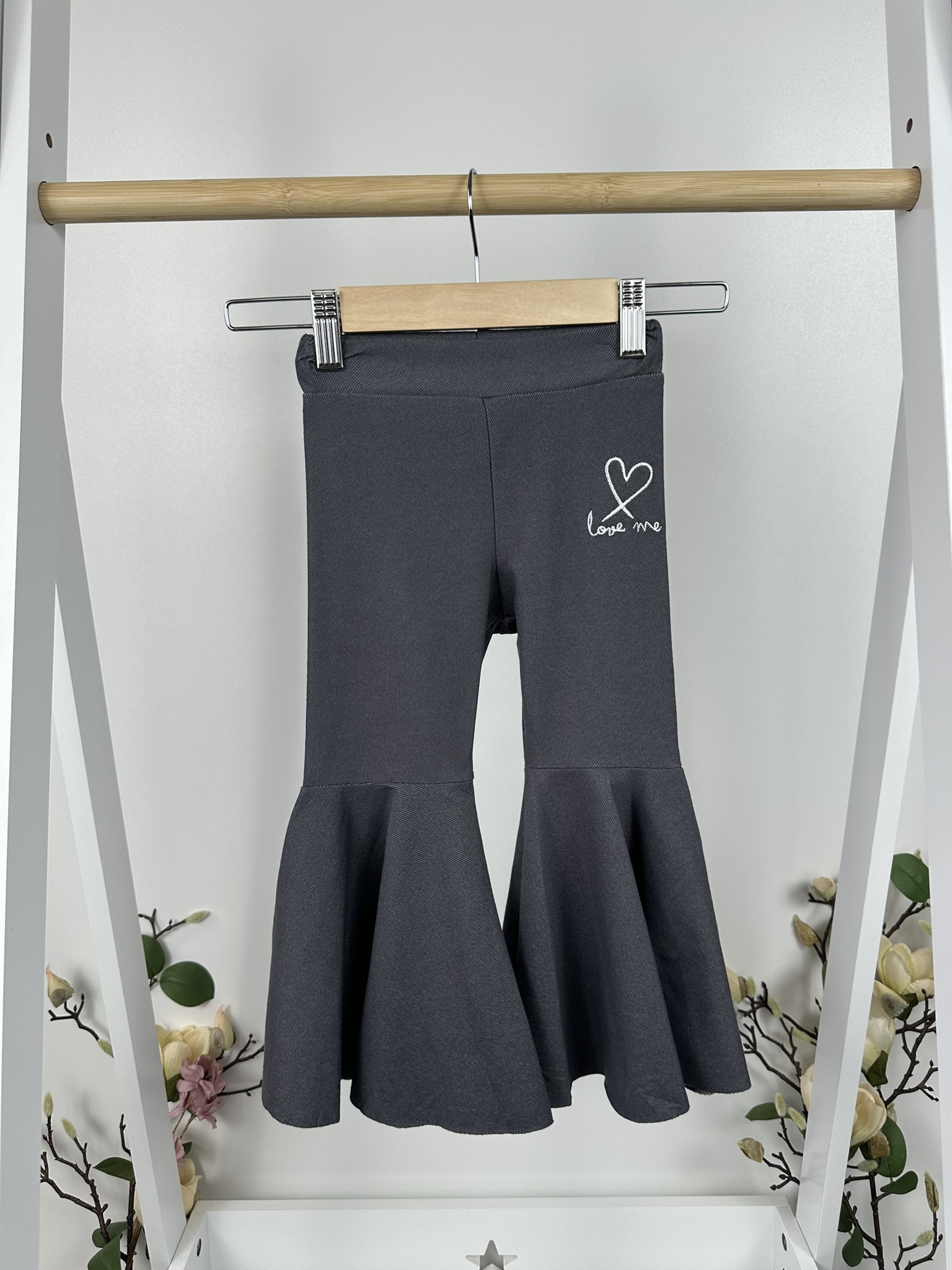 За момиченцата с модерен дух! Този стилен тъмен панталон с разкроени крачоли и надпис „love me“ с малко сърце в горната част е перфектната комбинация между удобство и шик. Съчетава се чудесно както с блузка, така и с по-елегантна горна част.