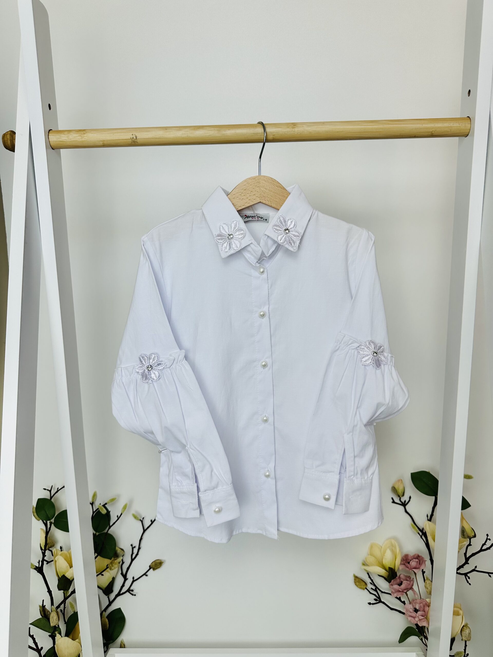 Нежна и стилна, тази риза е идеалният избор за специални поводи или за по-официална визия в училище. Тя съчетава класическа кройка с деликатна декорация.