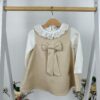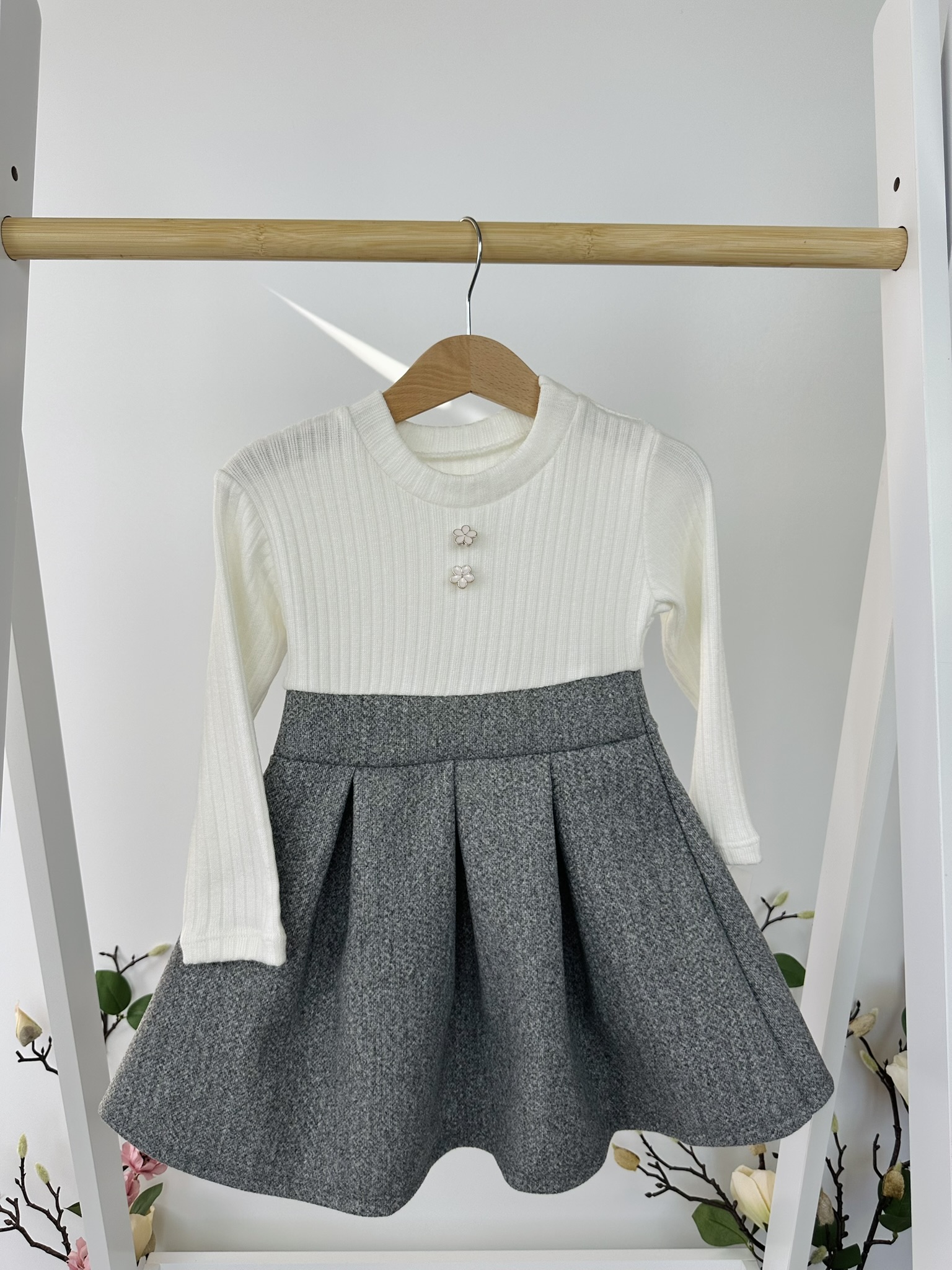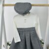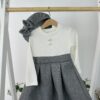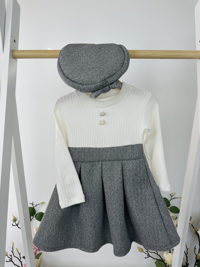 Елегантна и стилна рокля, създадена за малките дами с усет към красотата. Моделът съчетава класическа горна част от фино рипсено плетиво с феерична вълнена пола в сив нюанс, придаваща обем и изисканост. Включената шапка с кокетна панделка завършва визията с нотка парижки чар.