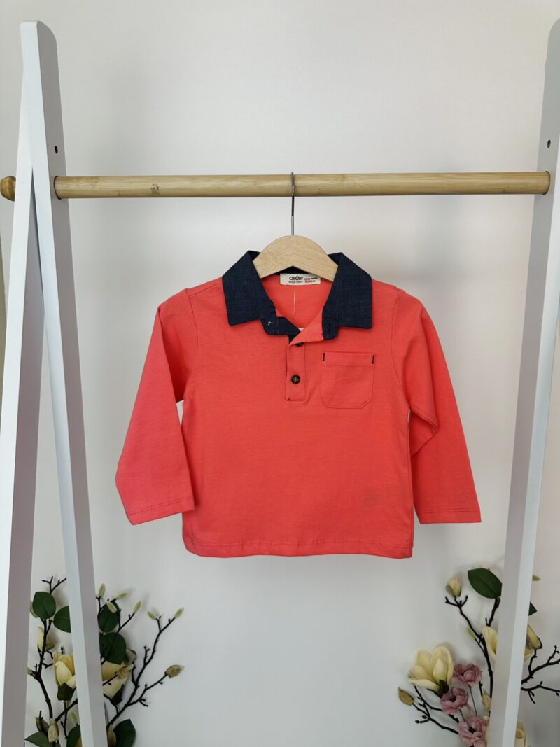 Тази красива червена блуза с тъмносиня яка е чудесен избор за малките момчета, които обичат да изглеждат стилно, но без компромис с удобството.