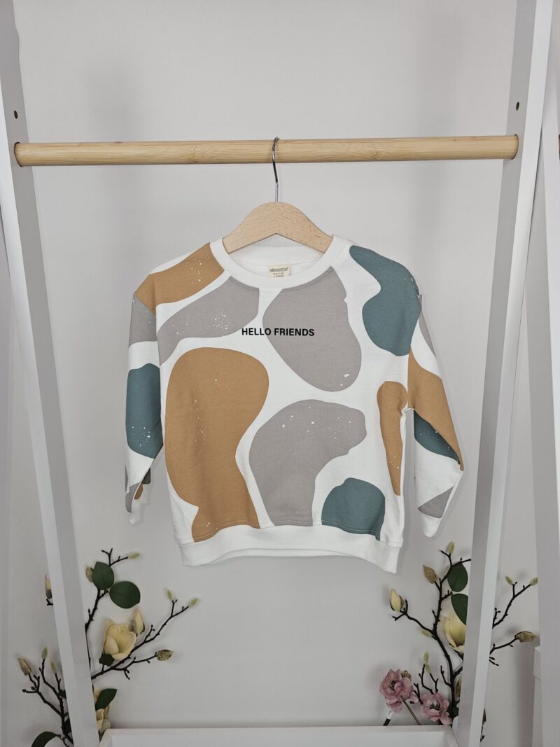 Тази цветна и забавна блуза с абстрактен принт носи свежест и настроение. Комбинацията от земни тонове и лекия блясък в детайлите я правят уникално предложение за модерните малчугани. Идеална за: ежедневие, игри, училище.