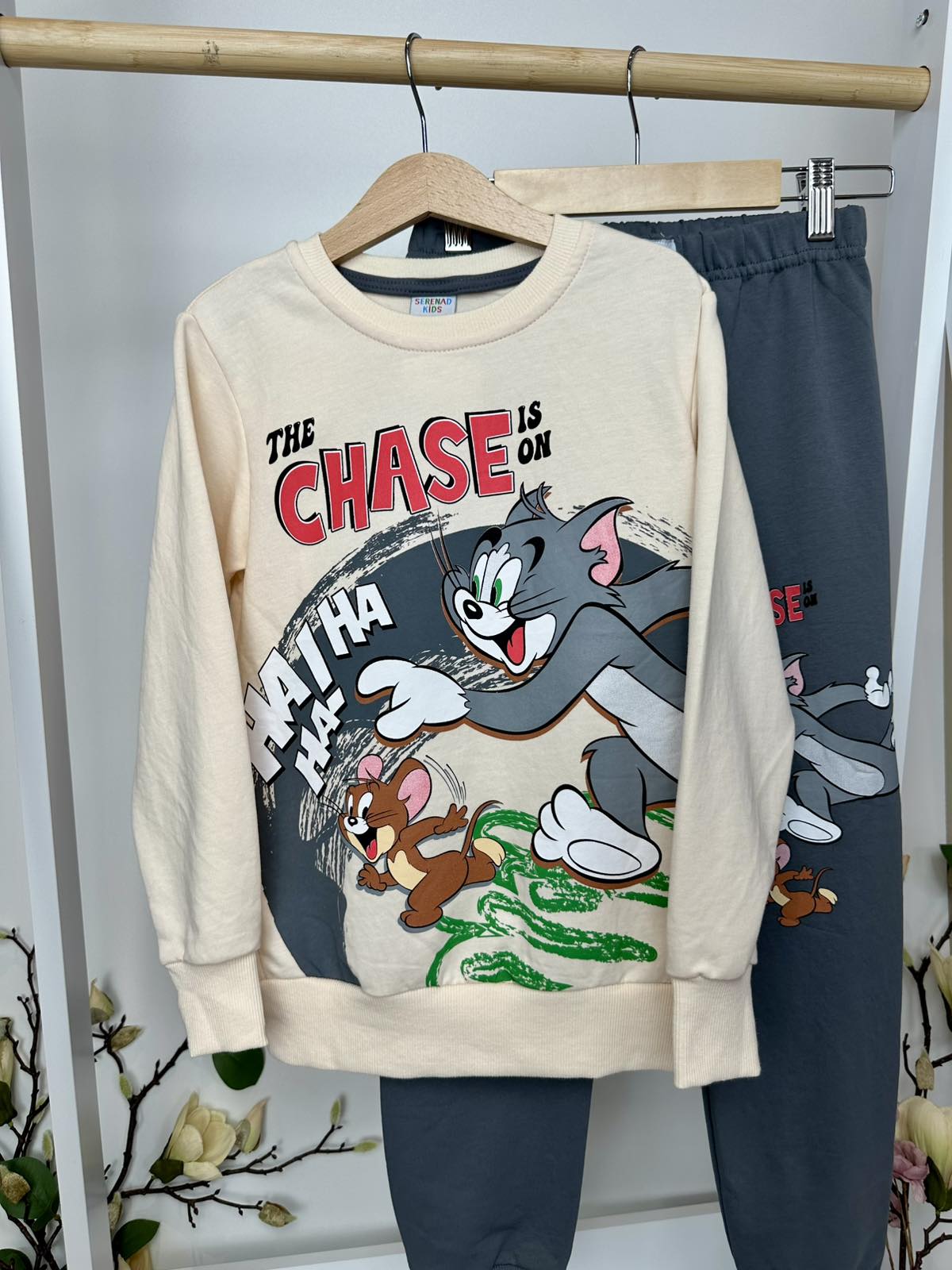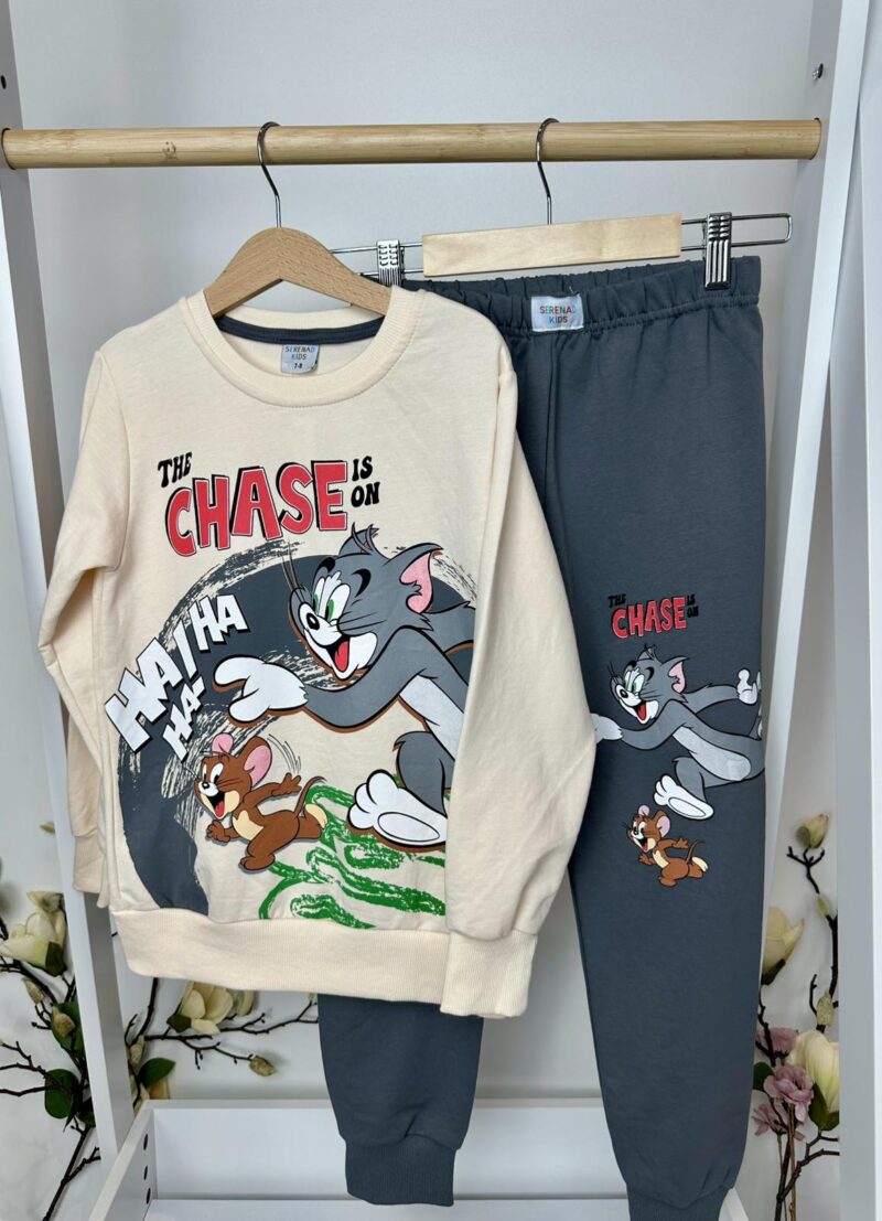Този комплект е създаден за малките фенове на класическите анимационни герои! Блузката със закачлив принт на Том и Джери е комбинирана с удобен спортен панталон, за да осигури пълен комфорт.