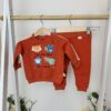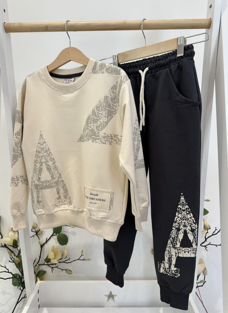 Този комплект е перфектното съчетание на стил и удобство! Бежовото горнище с изчистени геометрични принтове придава модерен и минималистичен вид. Ластичните маншети и овалното деколте осигуряват комфорт и лесно обличане. Панталонът с акцентен принт завършва визията, като му придава спортно-елегантен вид. Перфектен за игри навън или небрежни разходки със семейството.