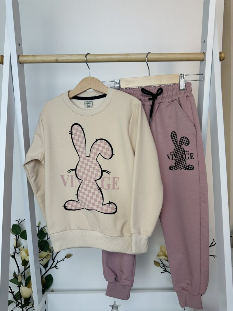 Сладък, удобен и с ретро чар – този комплект с блузка и панталон с зайче е идеален за игри и разходки.