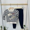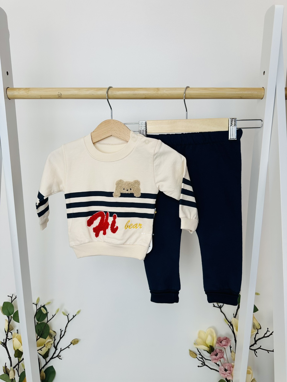 Очарователен спортно-елегантен комплект за момченце, съчетаващ комфорт и модерна визия. Светлото горнище е украсено с плюшена апликация на меченце, приветстващо с игрив надпис „Hi Bear“. Тъмносините райета по ръкавите придават моряшки стил, а меката и топла материя гарантира удобство през целия ден.