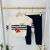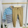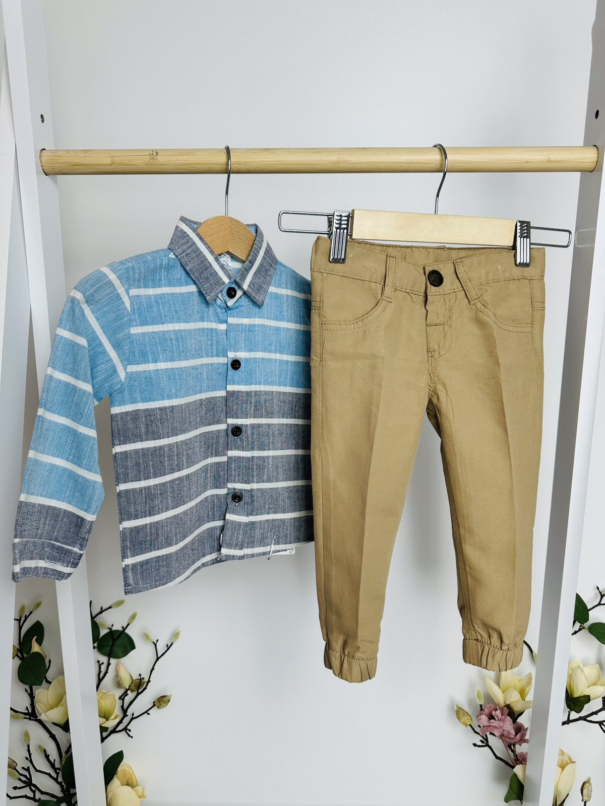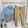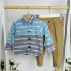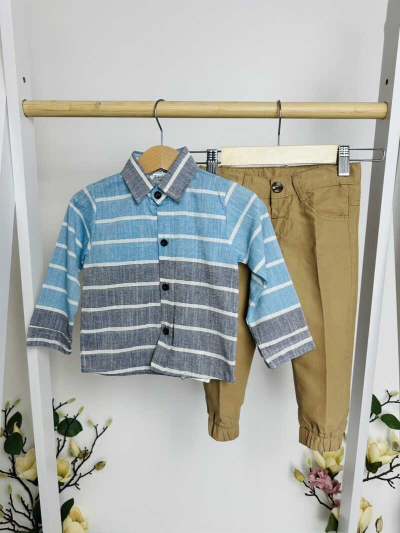 Този елегантен комплект включва риза с дълъг ръкав в стилни сини и сиви райета и удобни панталони в топъл бежов цвят. Ризата се закопчава с копчета и има класическа яка, придавайки завършен вид на малкия господин. Панталоните са със стилен дизайн, с ластик в долната част за перфектно прилягане и свобода на движение.