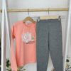 Изискан и удобен – този комплект е перфектен избор за малки дами с вкус. Блузката с дълъг ръкав в топъл оранжев цвят е украсена с нежна дантелена апликация и малък принт, който добавя ретро чар. Сивият клин балансира визията и осигурява удобство. Идеален за: игри, фотосесии, разходки.
