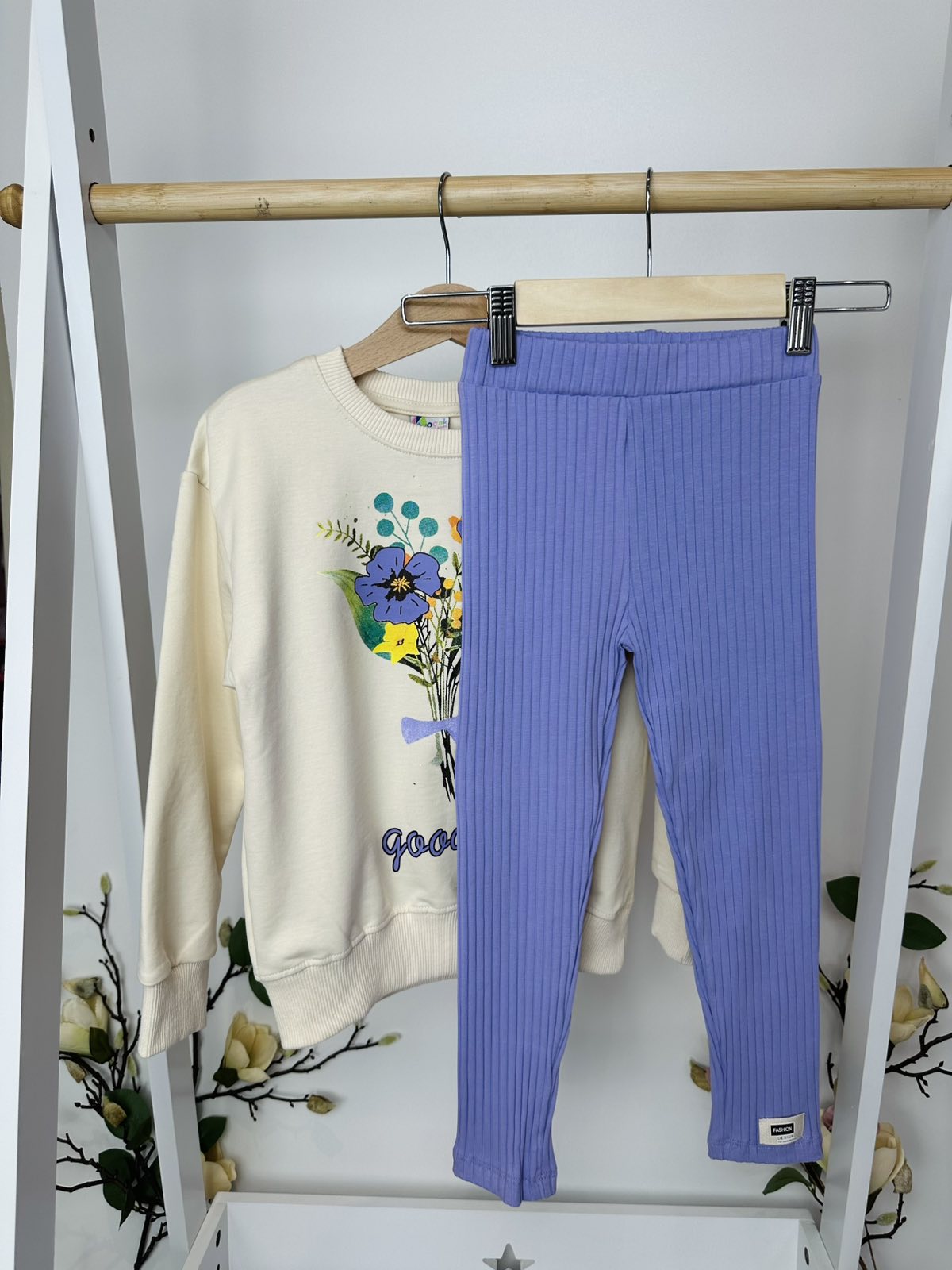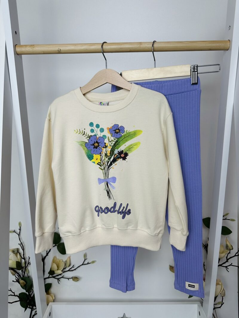 ✨ Какво го прави специален? Очарователен комплект, който съчетава мекота и стил. Бежовата блуза с флорален мотив създава романтично усещане, а клинът в нежен лавандулов нюанс добавя завършеност на визията.