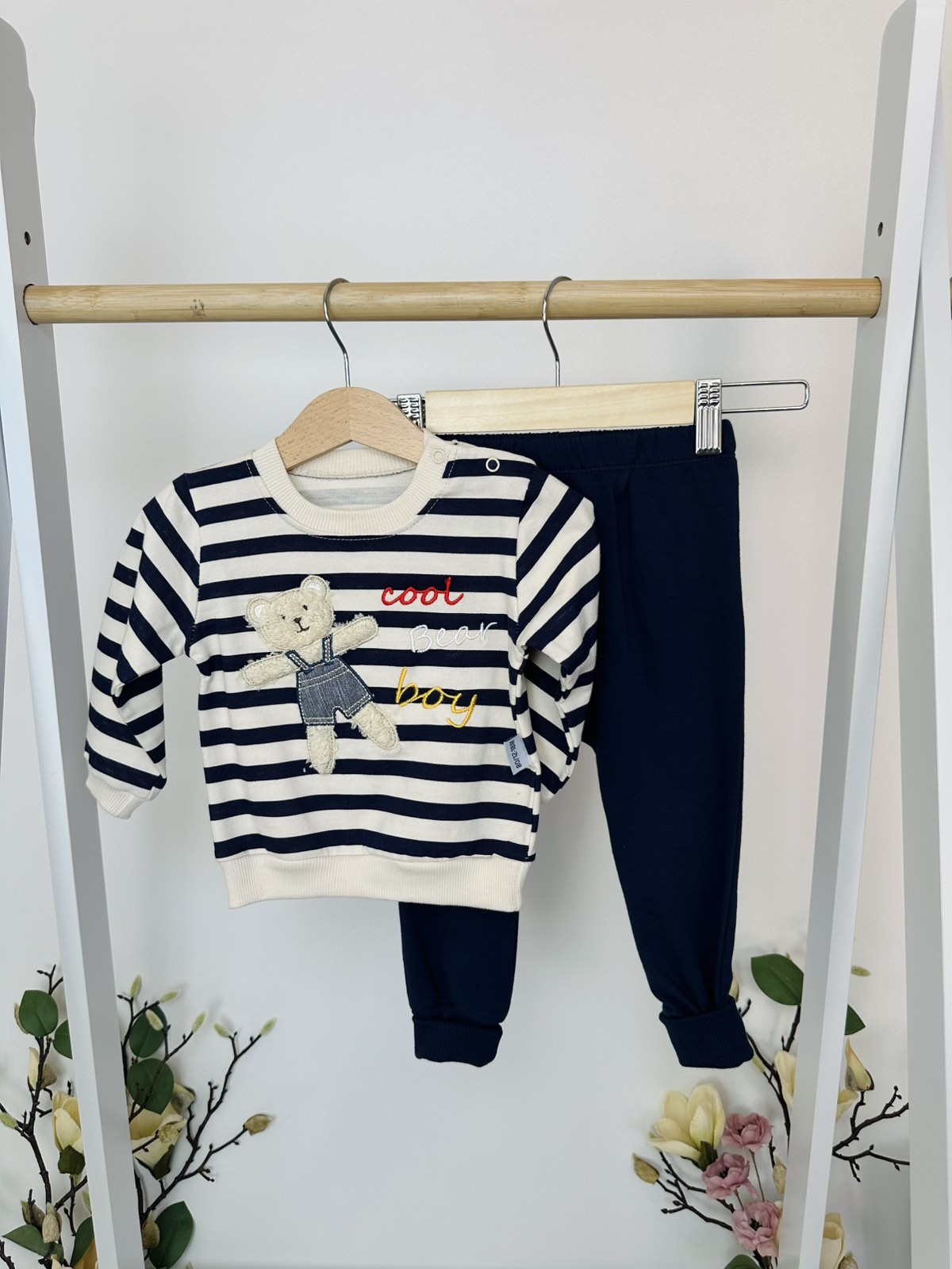 Очарователен детски комплект, който съчетава класическо моряшко райе с мек и топъл дизайн. Горнището е украсено с релефна плюшена апликация на меченце, носещо стилни къси панталонки. Забавните надписи „Cool Bear Boy“ добавят игрив акцент, който ще зарадва всяко дете.