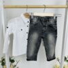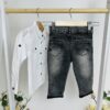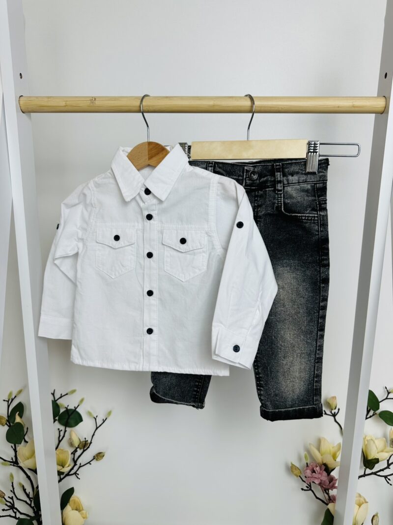 Търсите идеалния комплект за малкия ви господин? Този елегантен сет съчетава класическа бяла риза с черни копчета и стилни сиви дънки с избелен ефект. Съвършеното облекло за специални поводи, празници или стилни ежедневни разходки.