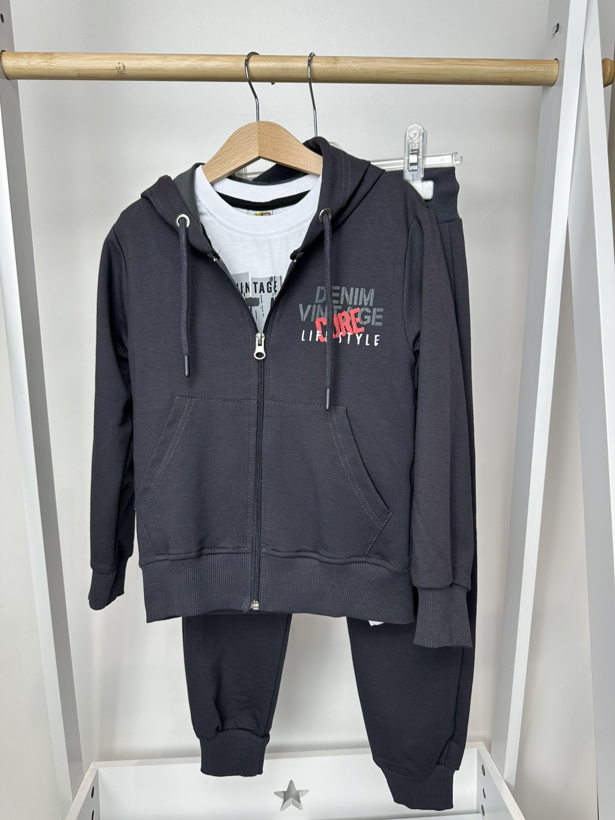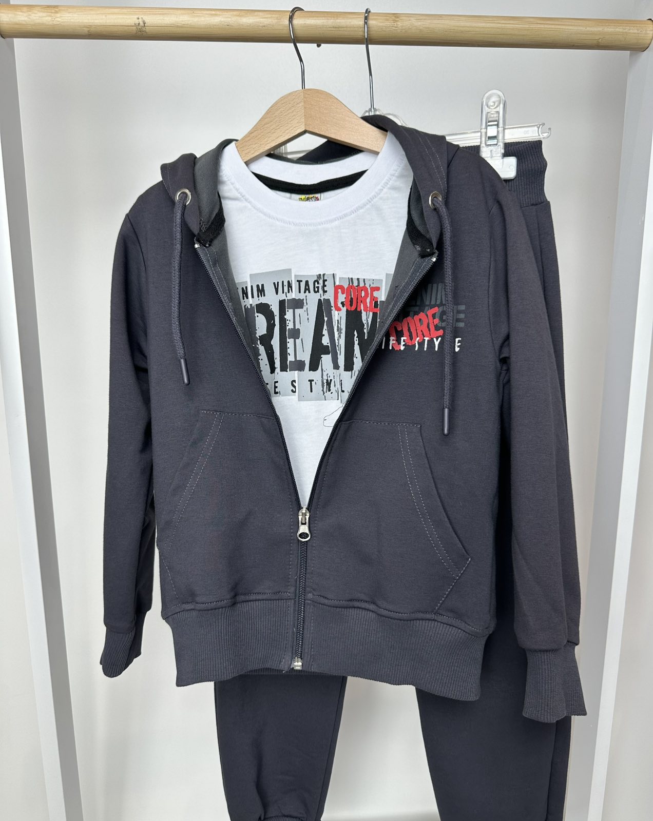 Тъмен спортен комплект с качулка. Този стилен и удобен комплект е създаден за малките любители на градския стил! Горнището с цип и качулка осигурява топлина и защита от вятър, а тениската с дълъг ръкав с интересен принт придава модерен акцент.