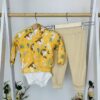 Подарете на вашето мъниче комфорт и свеж стил с този очарователен комплект. Яркото горнище с качулка в топъл горчичен нюанс е изпъстрено с игриви горски мотиви – сладки бухалчета, птици и листа, които създават приказна атмосфера. Закопчаването с копчета улеснява обличането, а качулката добавя уют.