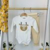 Бодито в неутрален цвят е с удобни тик-так копчета за бърза смяна, а меките панталонки с ластични маншети осигуряват свобода на движението през целия ден.